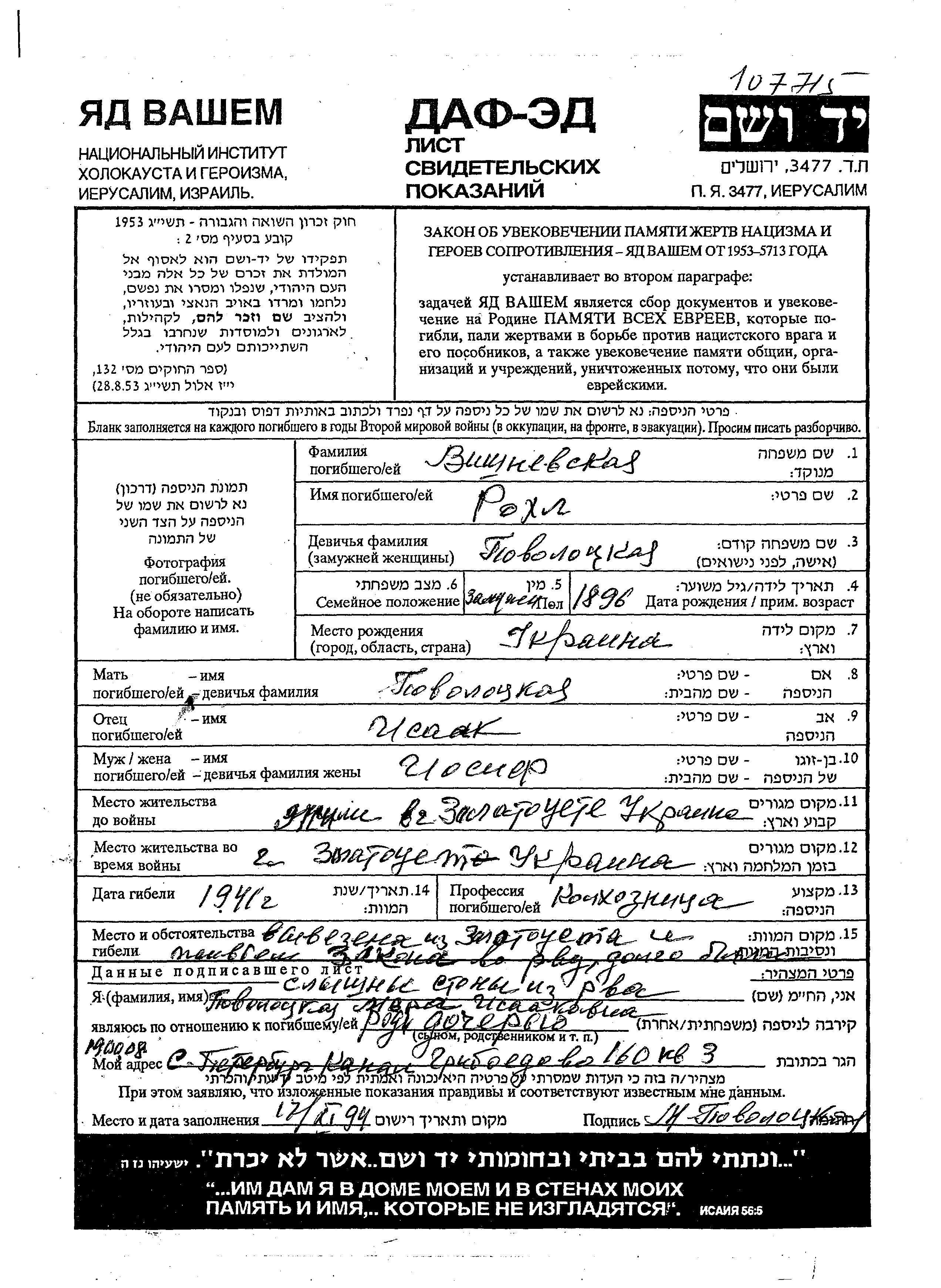 Rokhl Vishnevski, geb. Povolotzki wurde im Jahr 1896 in Ukraine (UdSSR) geboren. Sie war die Tochter von Isaak. Sie war Landwirt und mit Yosef Verheiratet. Vor dem Zweiten Weltkrieg lebte sie in Ukraine (UdSSR). Während des Krieges war sie in Ukraine (UdSSR).