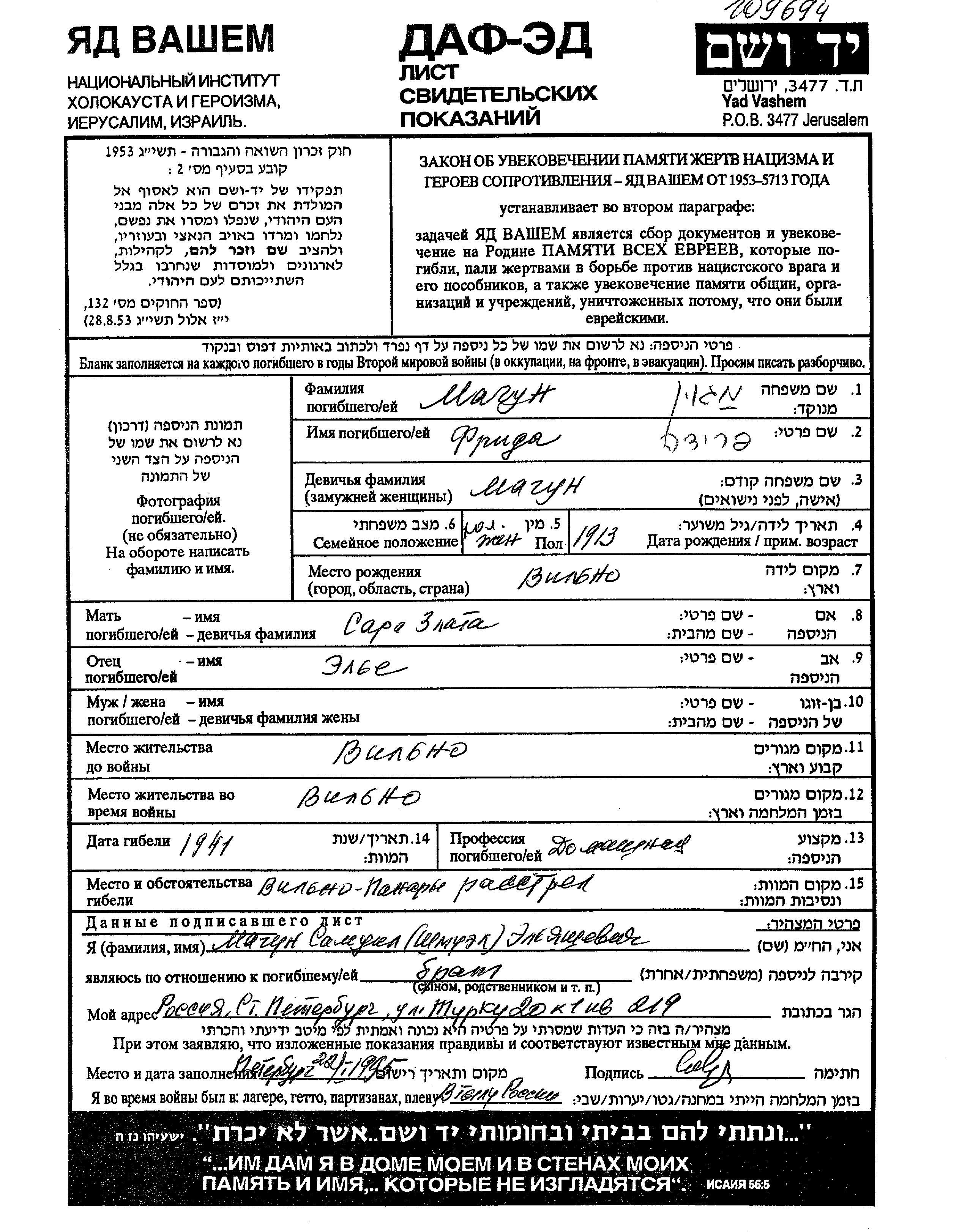 Frida Magun wurde im Jahr 1913 in Wilno, Polen geboren. Sie war die Tochter von Elie Alia und Sara Zlata. Sie war Hausfrau. Vor dem Zweiten Weltkrieg lebte sie in Wilno, Polen. Während des Krieges war sie in Wilno, Polen.