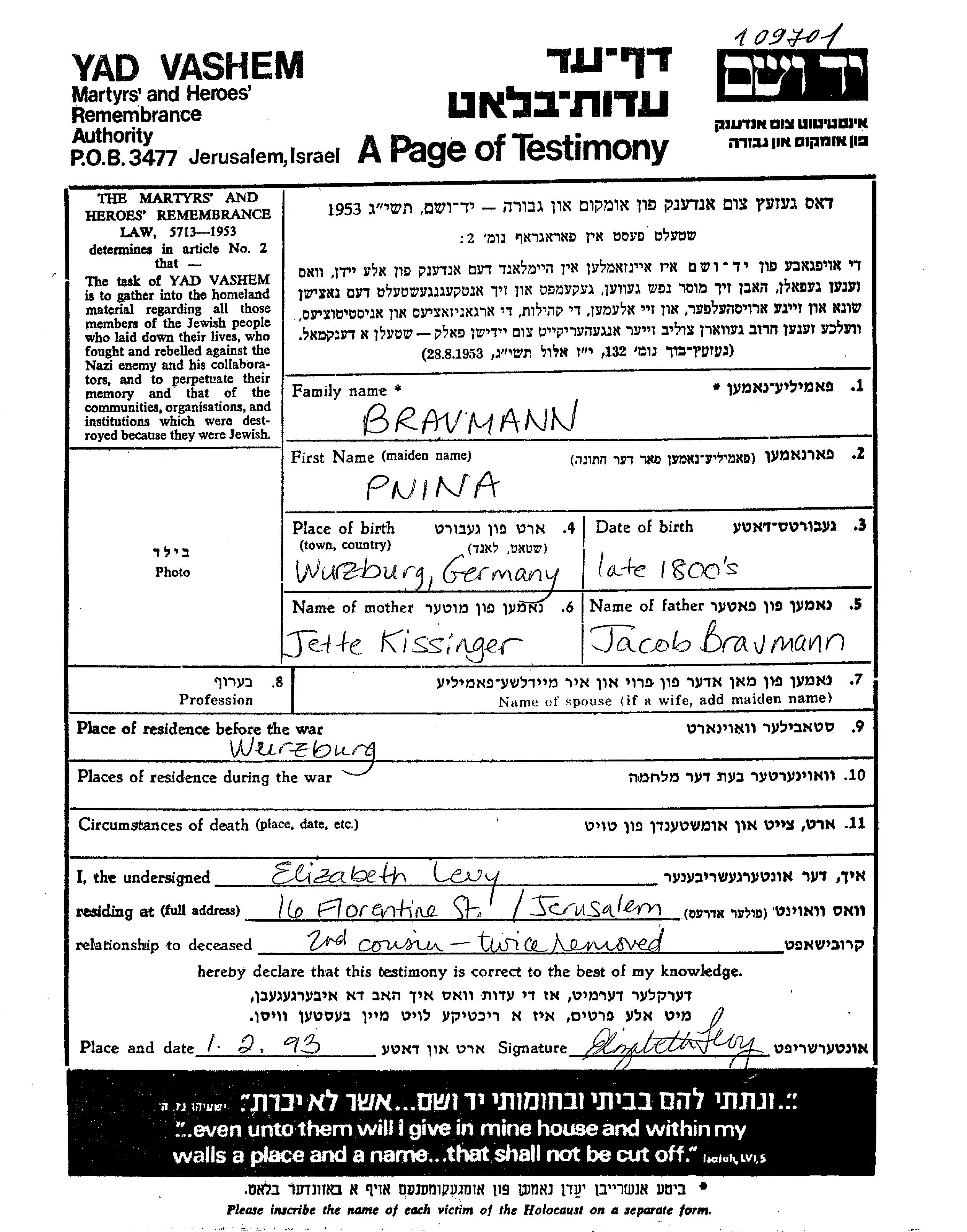 Pnina Bravmann wurde in Wuerzburg, Deutsches Reich geboren. Sie war die Tochter von Jacob und Jette, geb. Kissinger. Vor dem Zweiten Weltkrieg lebte sie in Wuerzburg, Deutsches Reich.
