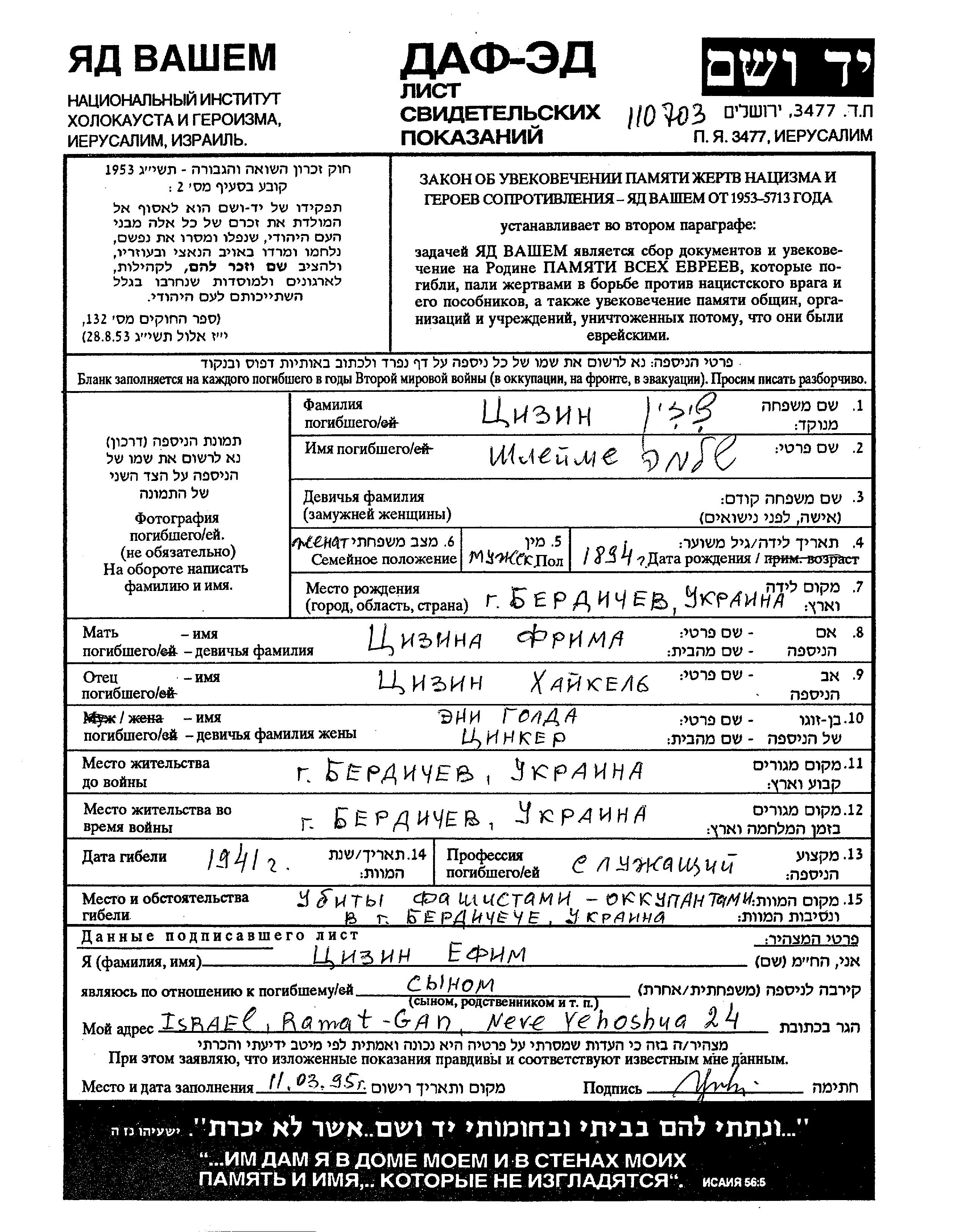 Shleime Tzizin wurde im Jahr 1894 in Berdichev, Ukraine (UdSSR) geboren. Er war der Sohn von Khaikel und Frima. Er war Angestellte/-r und mit Ana Golda Verheiratet. Vor dem Zweiten Weltkrieg lebte er in Berdichev, Ukraine (UdSSR). Während des Krieges war er in Berdichev, Ukraine (UdSSR).