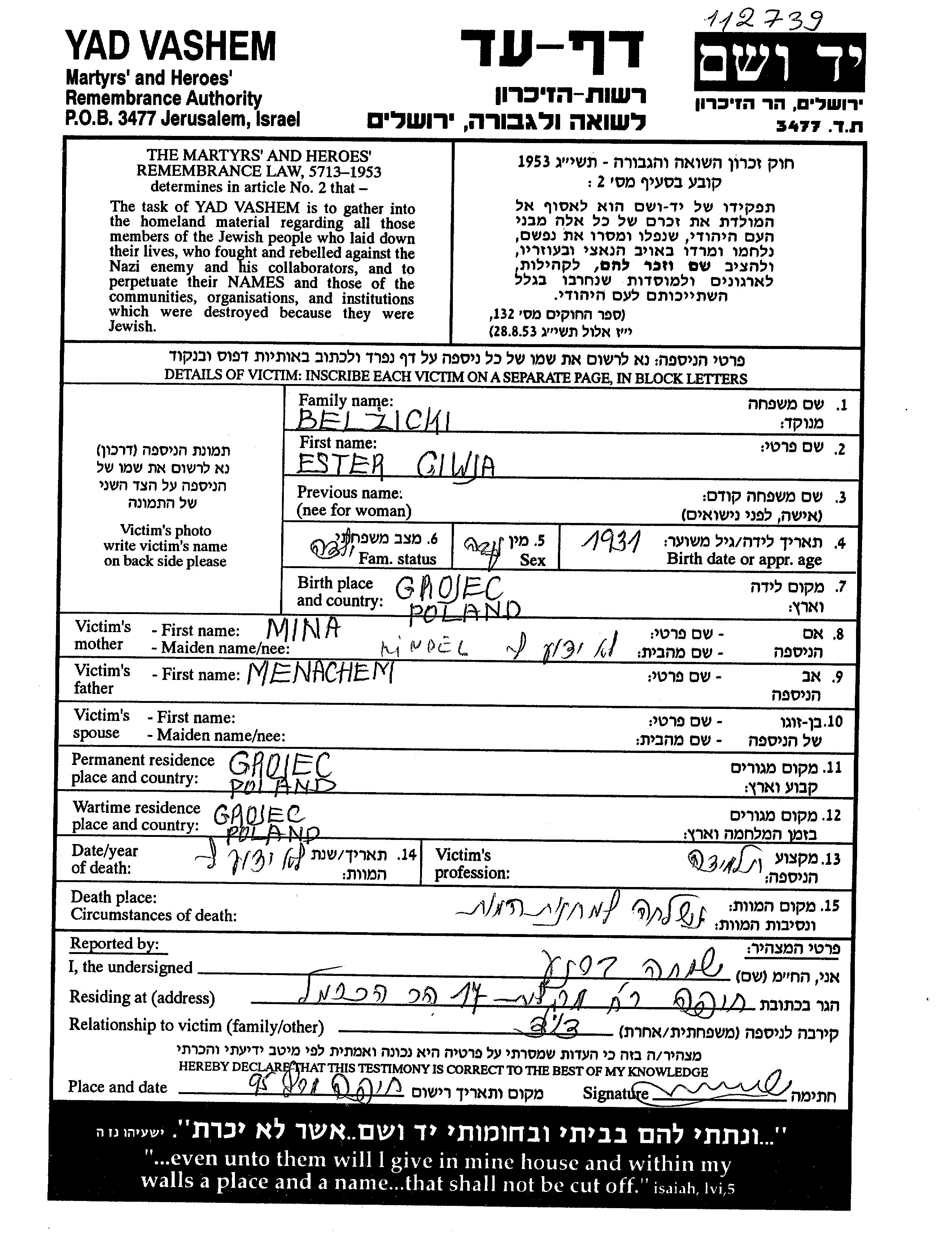 Ciwia Ester Belzicki wurde im Jahr 1931 in Grojec, Polen geboren. Sie war die Tochter von Menachem und Mindl. Sie war Schüler/-in und Kind. Vor dem Zweiten Weltkrieg lebte sie in Grojec, Polen. Während des Krieges war sie in Grojec, Polen.