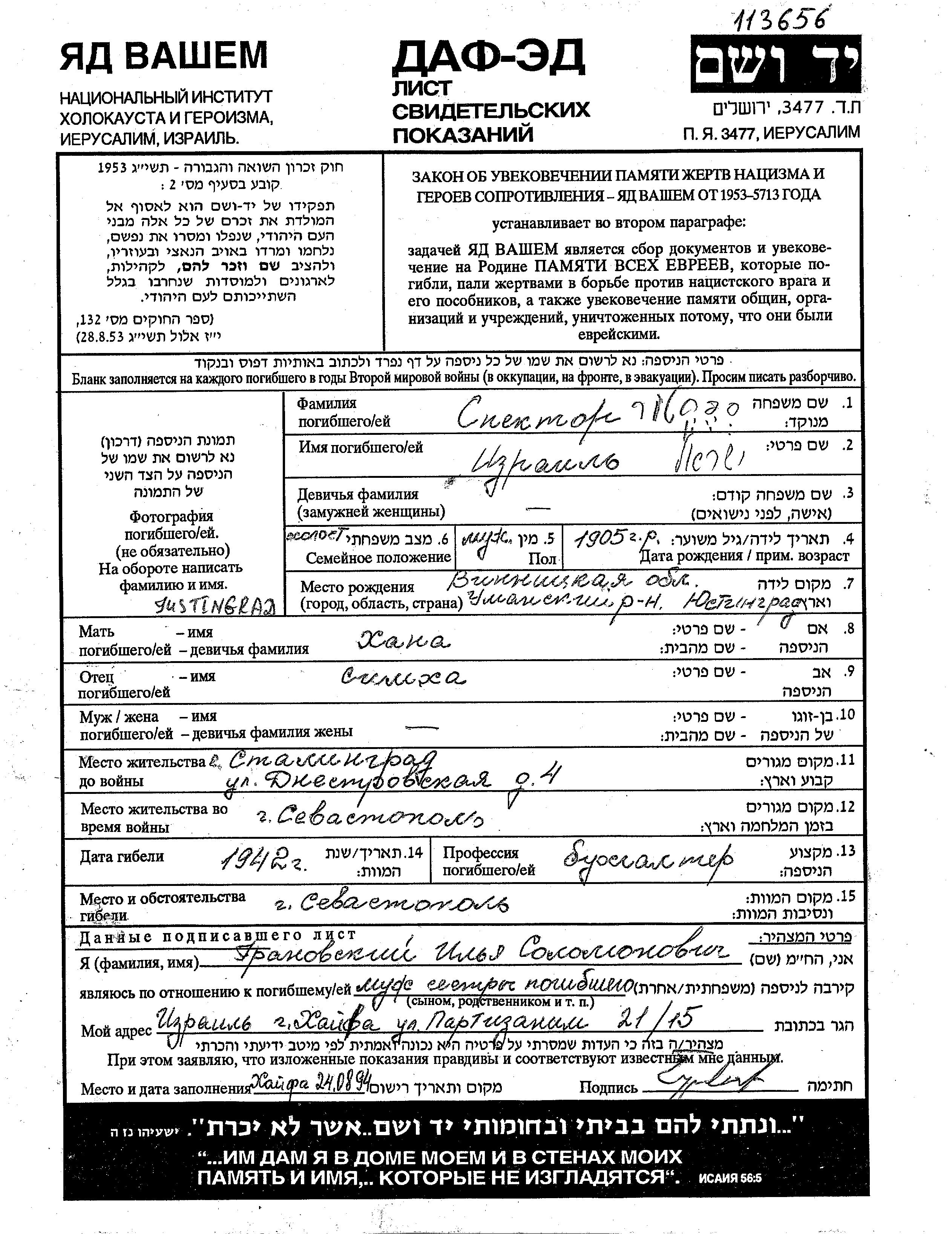 Izrail Spektor wurde im Jahr 1905 in Justingrad, Ukraine (UdSSR) geboren. Er war der Sohn von Simkha und Khana. Er war Buchhalter/-in und Ledig. Vor dem Zweiten Weltkrieg lebte er in Stalingrad, Russland (UdSSR). Während des Krieges war er in Sevastopol, Russland (UdSSR).