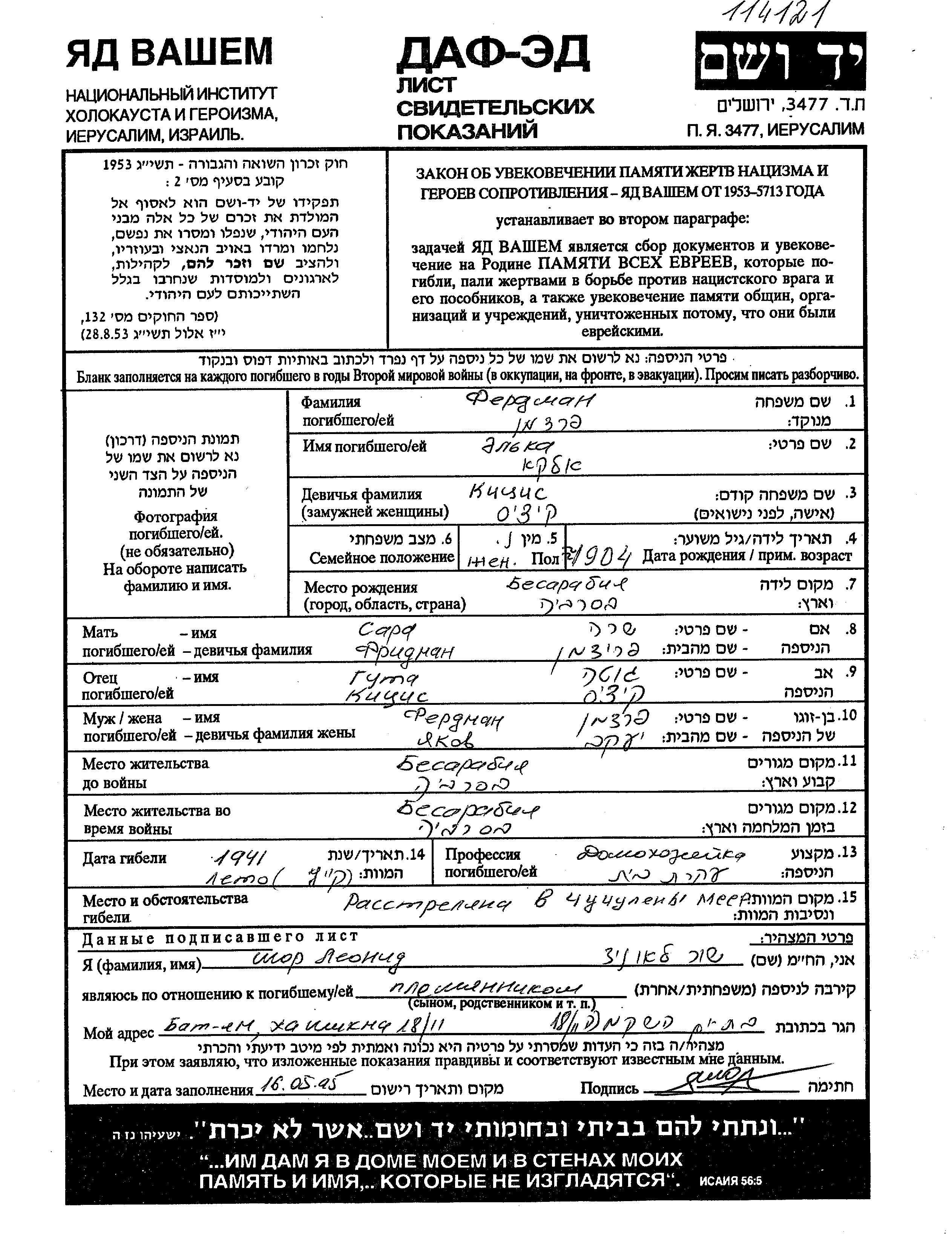 Elka Ferdman, geb. Kitzis wurde im Jahr 1904 in Bessarabia, Rumänien geboren. Sie war die Tochter von Guta und Sara, geb. Fridman. Sie war Hausfrau und mit Yakov Verheiratet. Vor dem Zweiten Weltkrieg lebte sie in Bessarabia, Rumänien. Während des Krieges war sie in Bessarabia, Rumänien.