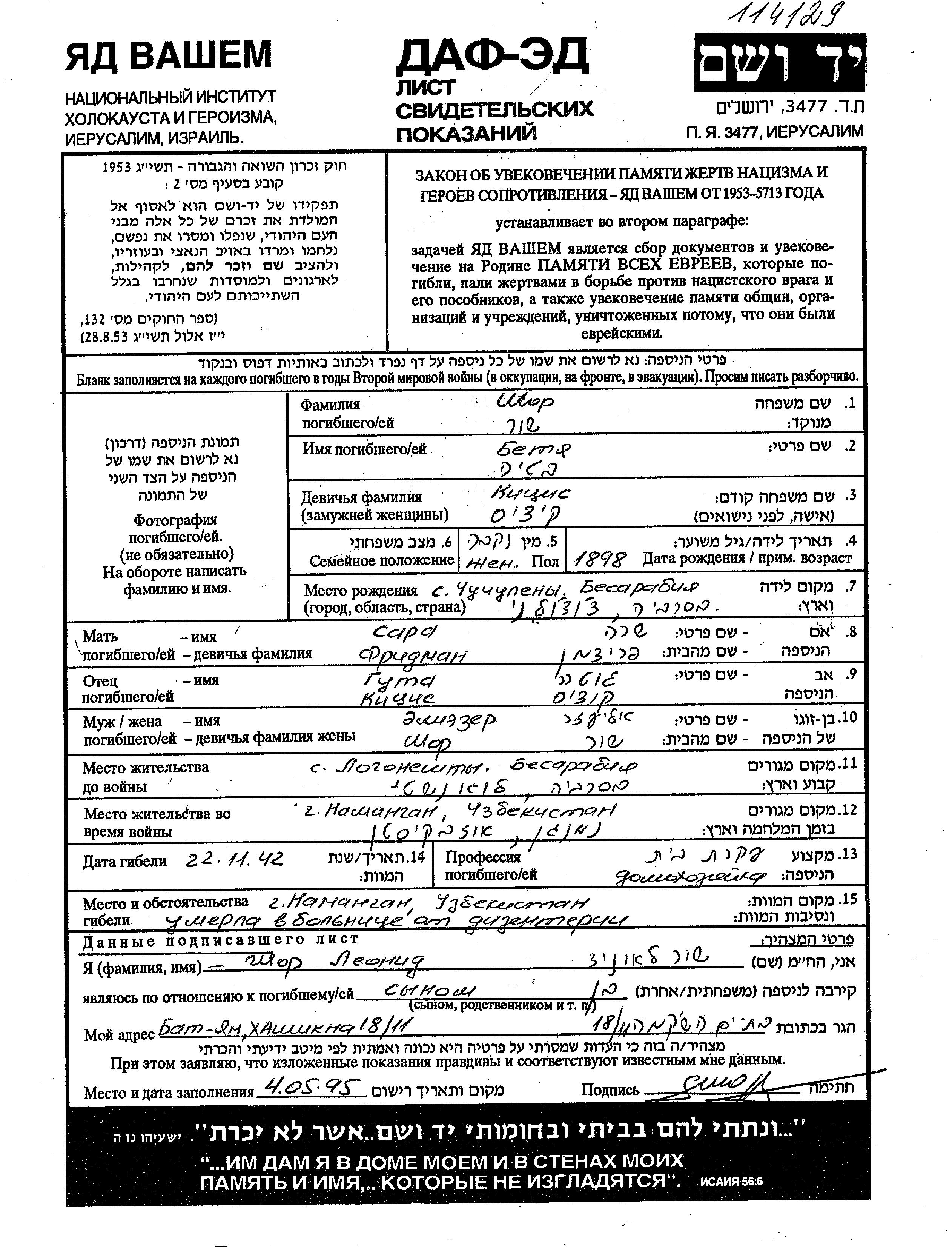 Betia Shor, geb. Kitzis wurde im Jahr 1898 in Ciuciuleni, Rumänien geboren. Sie war die Tochter von Guta und Sara, geb. Fridman. Sie war Hausfrau und mit Eliezer Verheiratet. Während des Krieges war sie in Namangan, Uzbekistan (UdSSR).