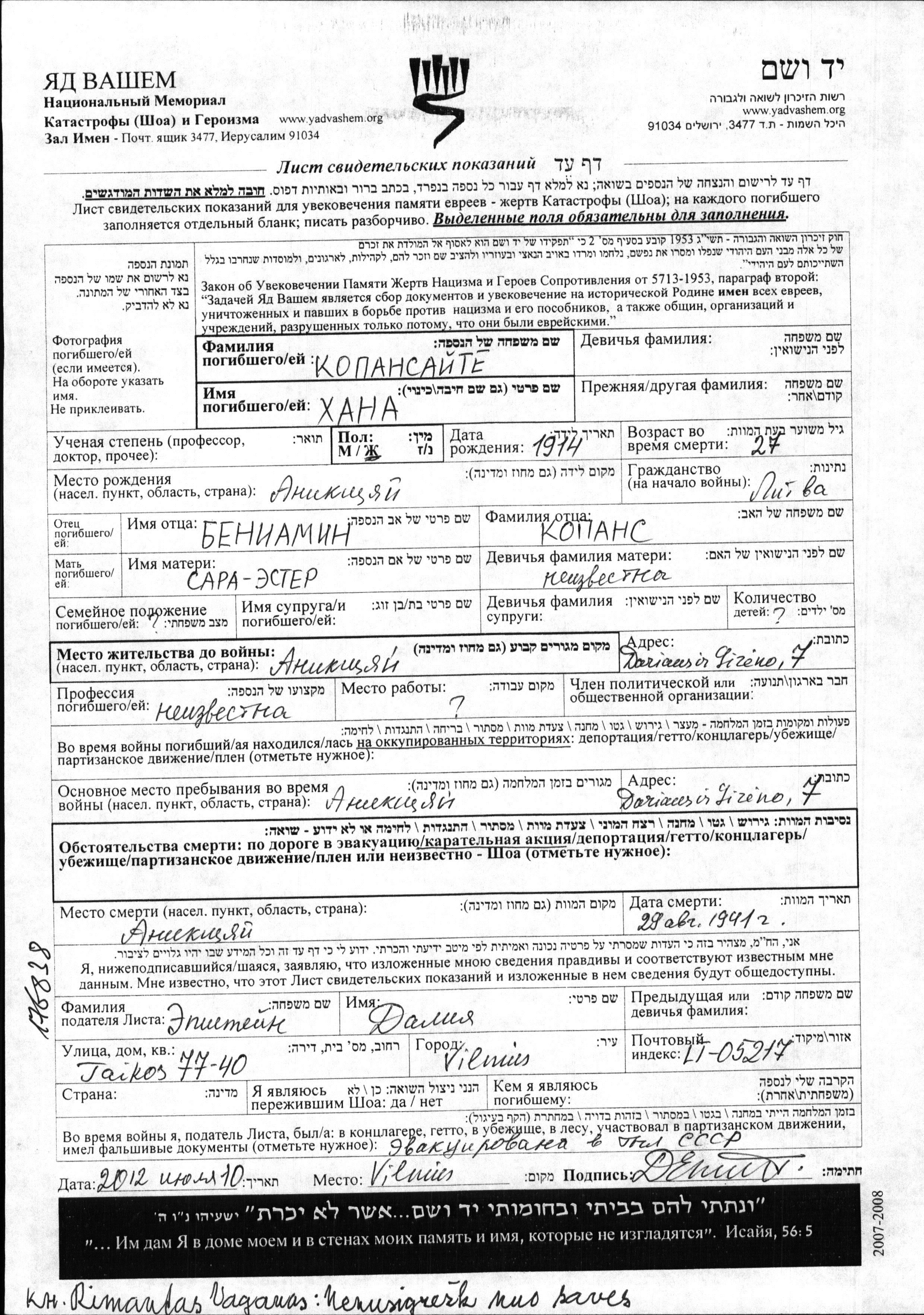 Khaimovich | Khana | 1914 | Aniksht, Litauen | Gedenkblatt |