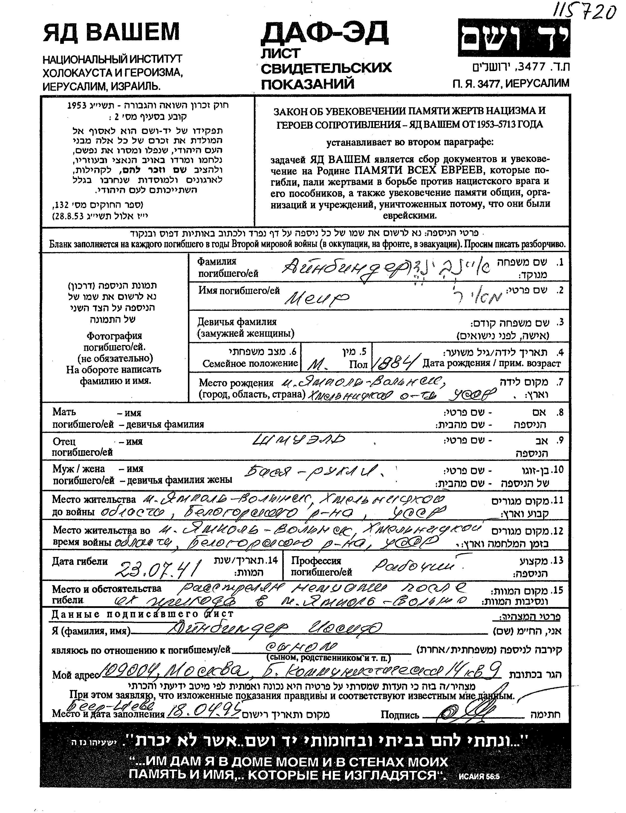 Meir Aynbinder wurde im Jahr 1884 in Yampol, Ukraine (UdSSR) geboren. Er war der Sohn von Shmuel. Er war Arbeiter/-in und mit Basia Rukhlia Verheiratet. Vor dem Zweiten Weltkrieg lebte er in Yampol, Ukraine (UdSSR). Während des Krieges war er in Yampol, Ukraine (UdSSR).