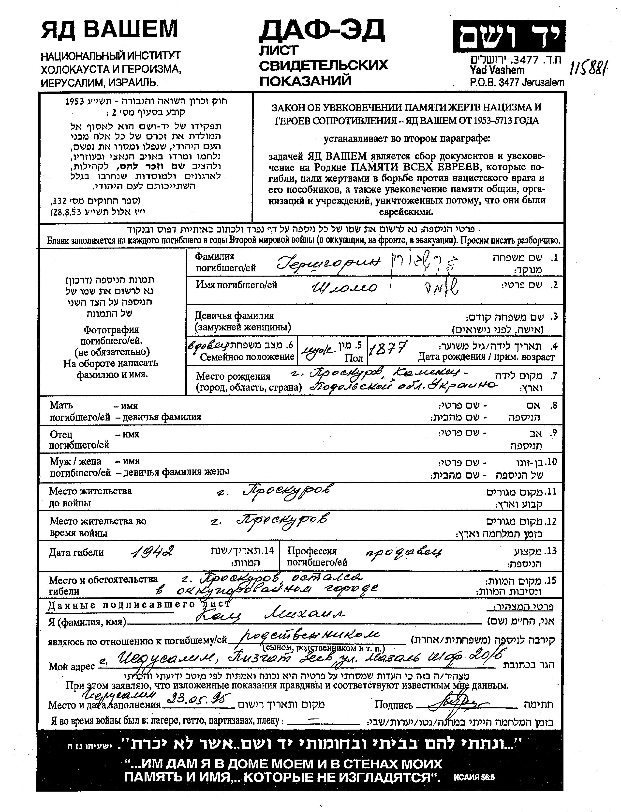 Shlomo Gershgorin wurde im Jahr 1877 in Proskurov, Ukraine (UdSSR) geboren. Er war Verkäufer/-in und Verwitwet. Vor dem Zweiten Weltkrieg lebte er in Proskurov, Ukraine (UdSSR). Während des Krieges war er in Proskurov, Ukraine (UdSSR).