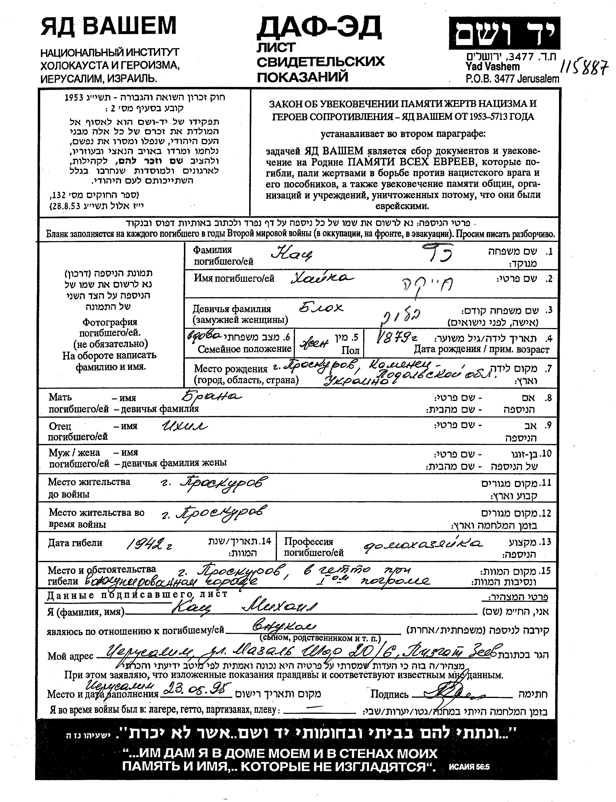 Khaika Katz, geb. Blokh wurde im Jahr 1879 in Proskurov, Ukraine (UdSSR) geboren. Sie war die Tochter von Ikhil und Brana. Sie war Hausfrau und Verwitwet. Vor dem Zweiten Weltkrieg lebte sie in Proskurov, Ukraine (UdSSR). Während des Krieges war sie in Proskurov, Ukraine (UdSSR).
