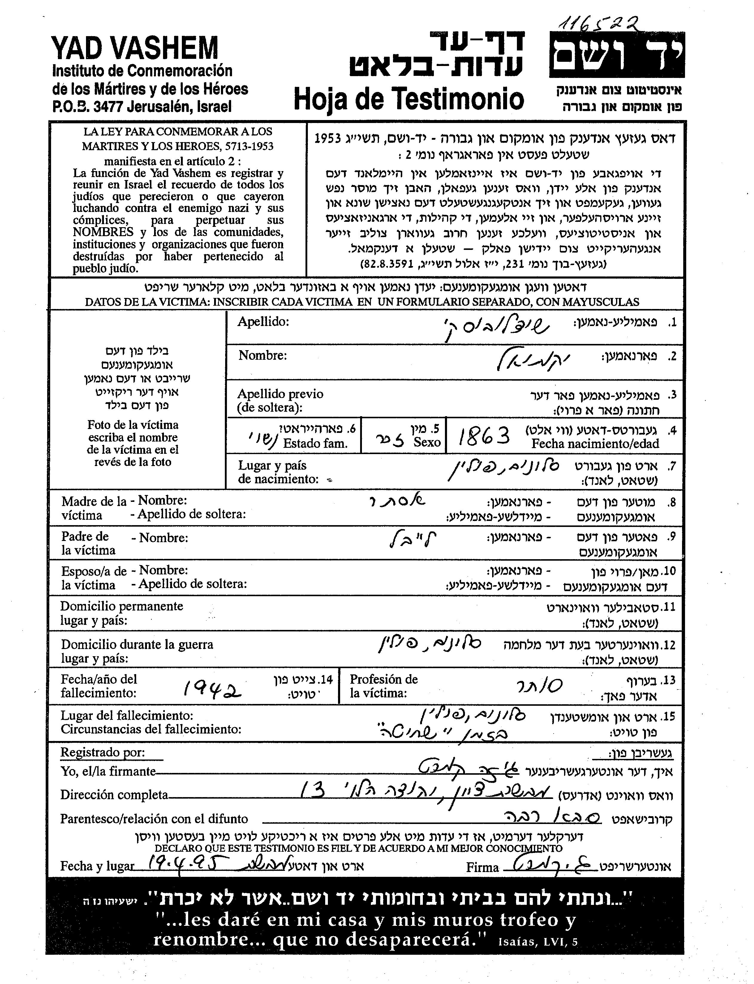 Yekutiel wurde in der Schoah ermordet. Todesort: Slonim, Polen im Jahr 1942.