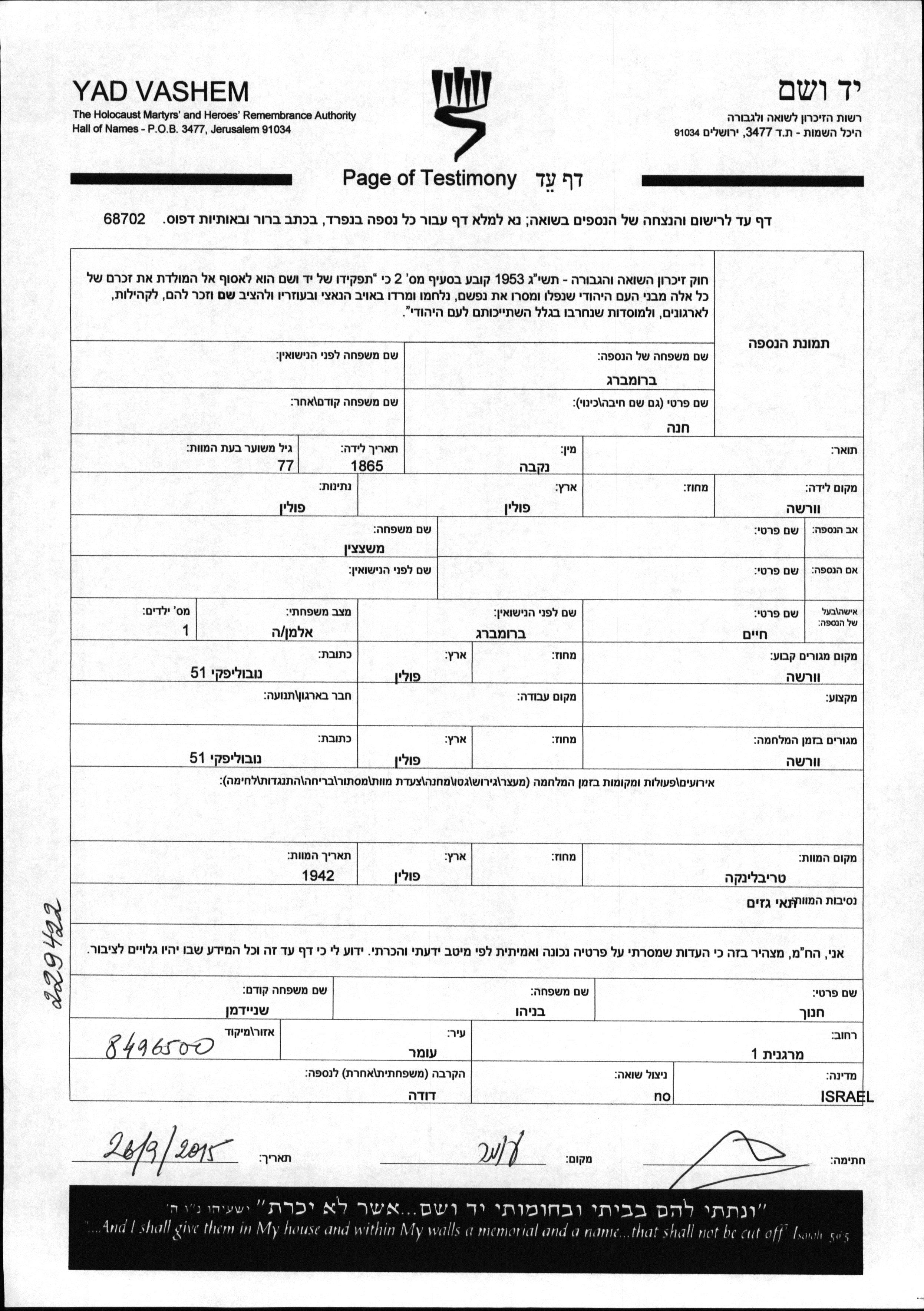 Khana Bromberg, geb. Myshtzin wurde im Jahr 1865 in Warszawa, Polen geboren. Sie war mit Chaim Witwe. Vor dem Zweiten Weltkrieg lebte sie in Warszawa, Polen. Während des Krieges war sie in Warszawa, Polen.