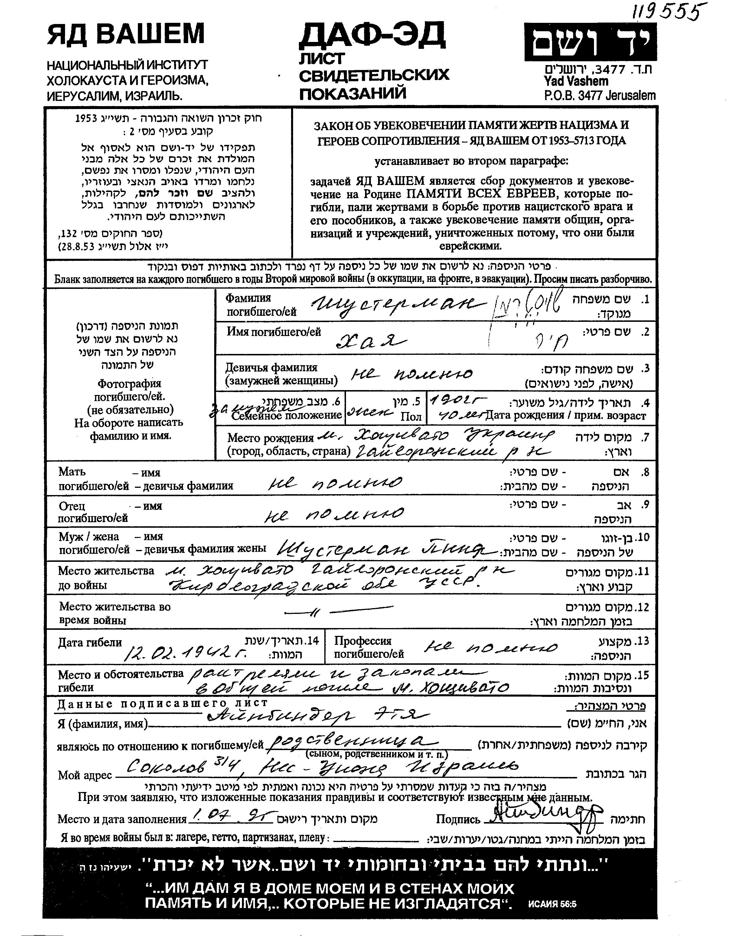 Khaia Shusterman wurde im Jahr 1902 in Khashchevatoye, Ukraine (UdSSR) geboren. Sie war mit Pinia Verheiratet. Vor dem Zweiten Weltkrieg lebte sie in Khashchevatoye, Ukraine (UdSSR). Während des Krieges war sie in Khashchevatoye, Ukraine (UdSSR).