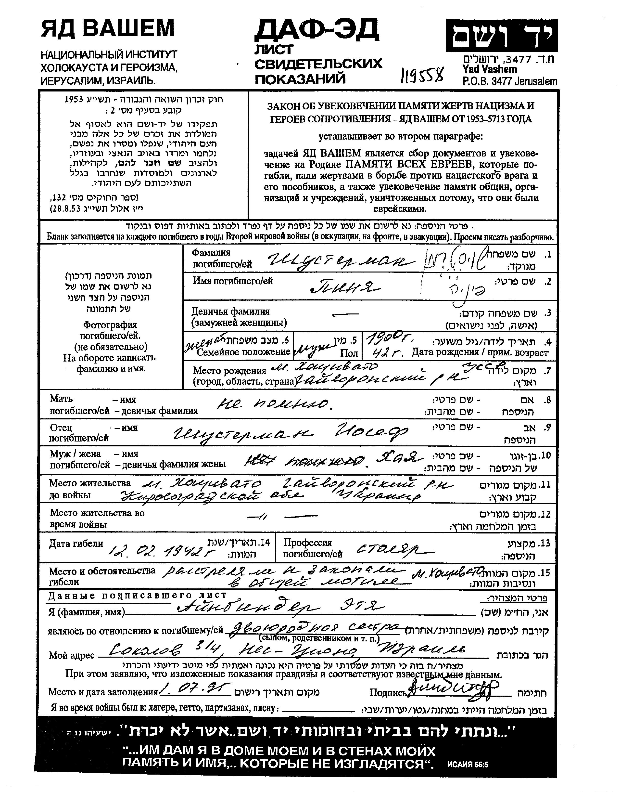 Pinia Shusterman wurde im Jahr 1900 in Khashchevatoye, Ukraine (UdSSR) geboren. Er war der Sohn von Yosef. Er war Zimmermann und mit Khaia Verheiratet. Vor dem Zweiten Weltkrieg lebte er in Khashchevatoye, Ukraine (UdSSR). Während des Krieges war er in Khashchevatoye, Ukraine (UdSSR).