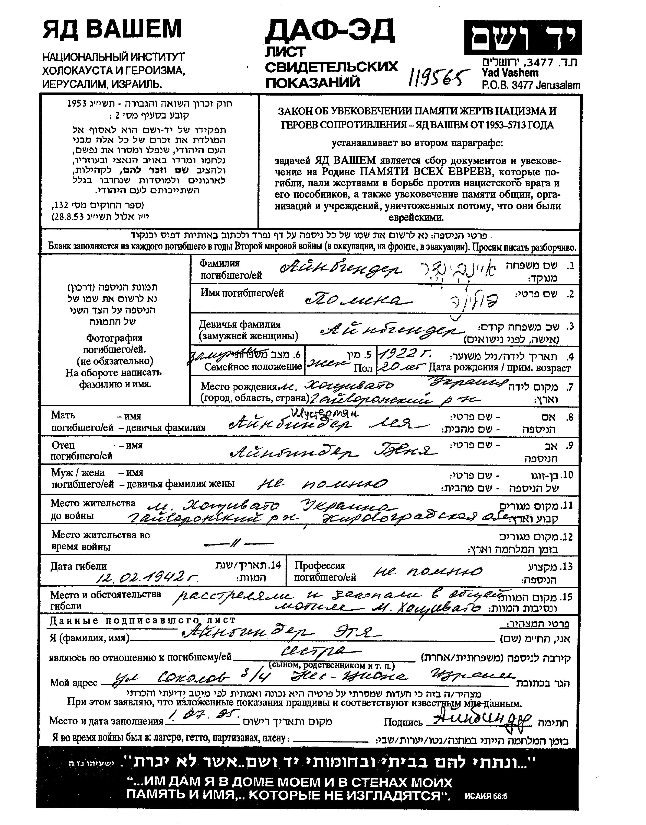 Aynbinder Polina 1922 Khashchevatoye, Ukraine (UdSSR) Gedenkblatt