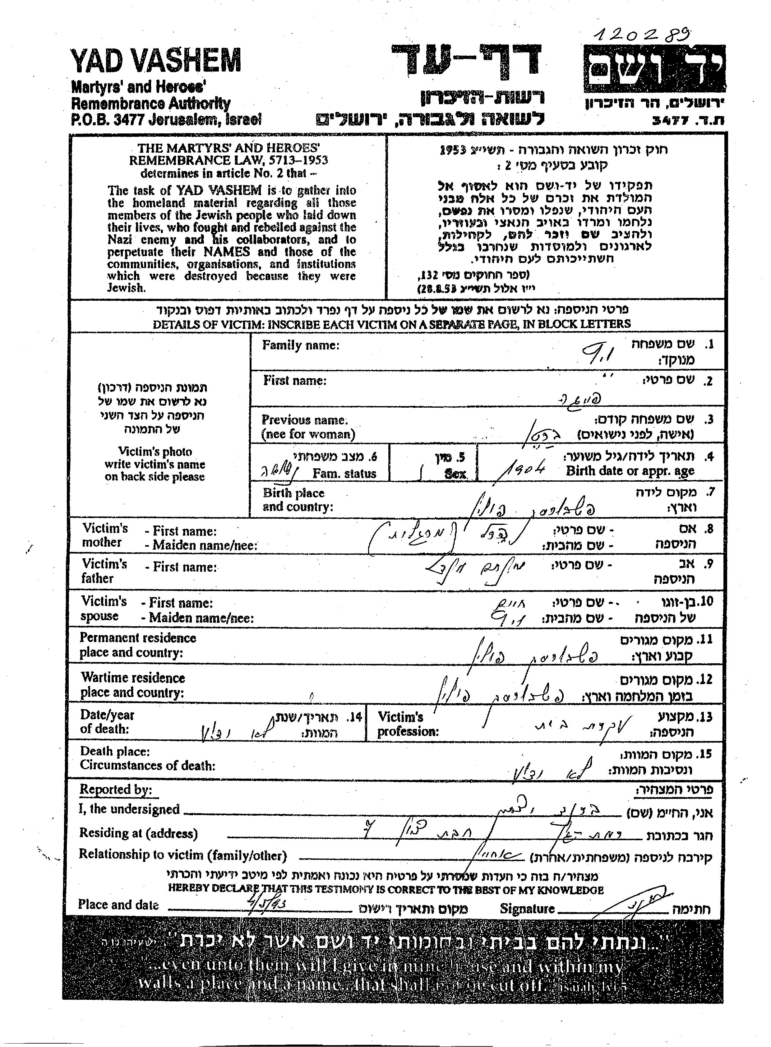 Feiga Weitz, geb. Bratel wurde im Jahr 1904 in Przeworsk, Polen geboren. Sie war die Tochter von Menakhem Mendel und Perl, geb. Margalit. Sie war Hausfrau und mit Khaim Verheiratet. Vor dem Zweiten Weltkrieg lebte sie in Przeworsk, Polen. Während des Krieges war sie in Przeworsk, Polen.