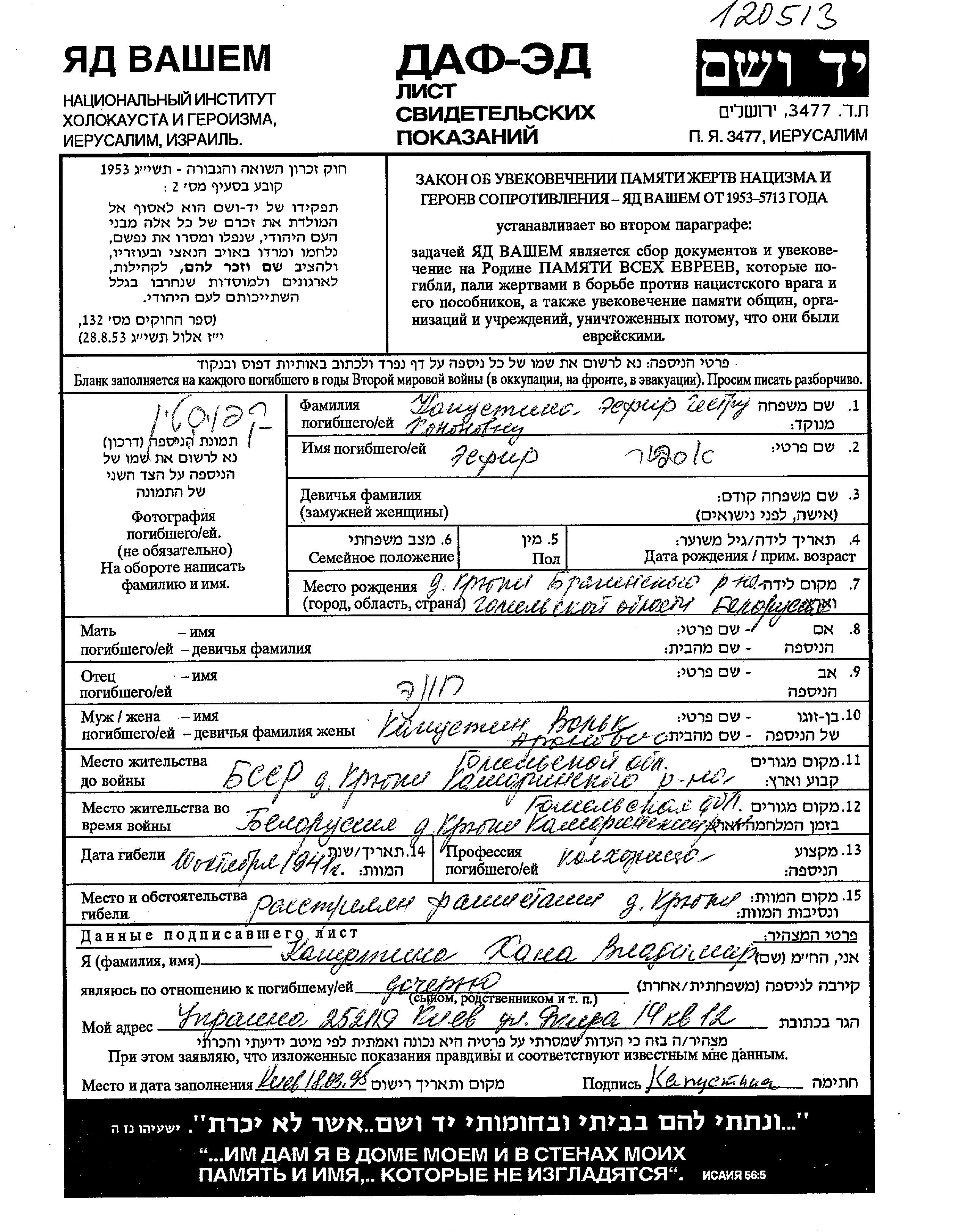 Esfir wurde in der Schoah ermordet. Todesort: Kryuki, Weißrussland (UdSSR) im Jahr 10/10/1941.