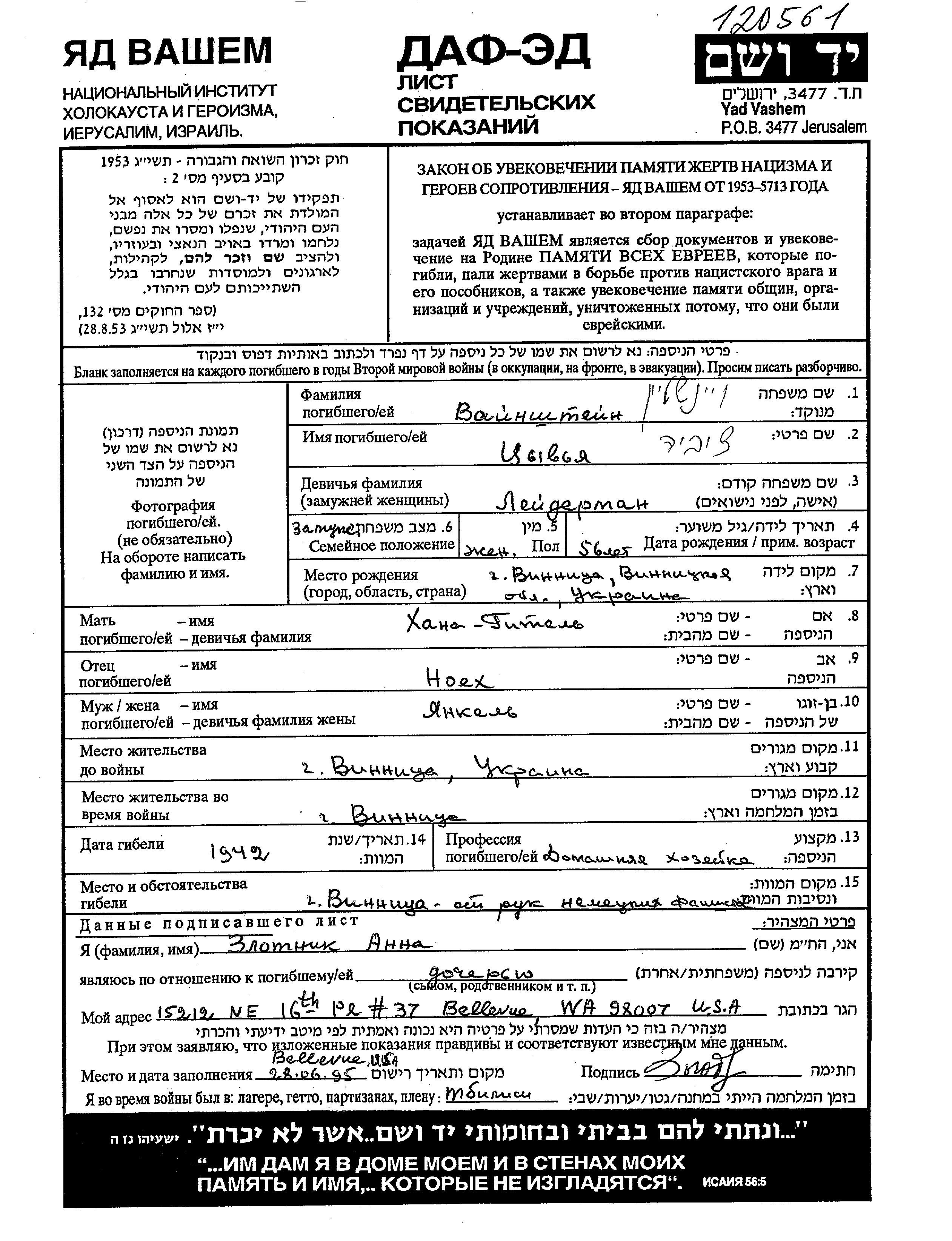 Tzvia Vainshtein, geb. Leiderman wurde im Jahr 1886 in Vinnitsa, Ukraine (UdSSR) geboren. Sie war die Tochter von Noakh und Khana Gitel. Sie war Hausfrau und mit Yankel Verheiratet. Vor dem Zweiten Weltkrieg lebte sie in Vinnitsa, Ukraine (UdSSR). Während des Krieges war sie in Vinnitsa, Ukraine (UdSSR).