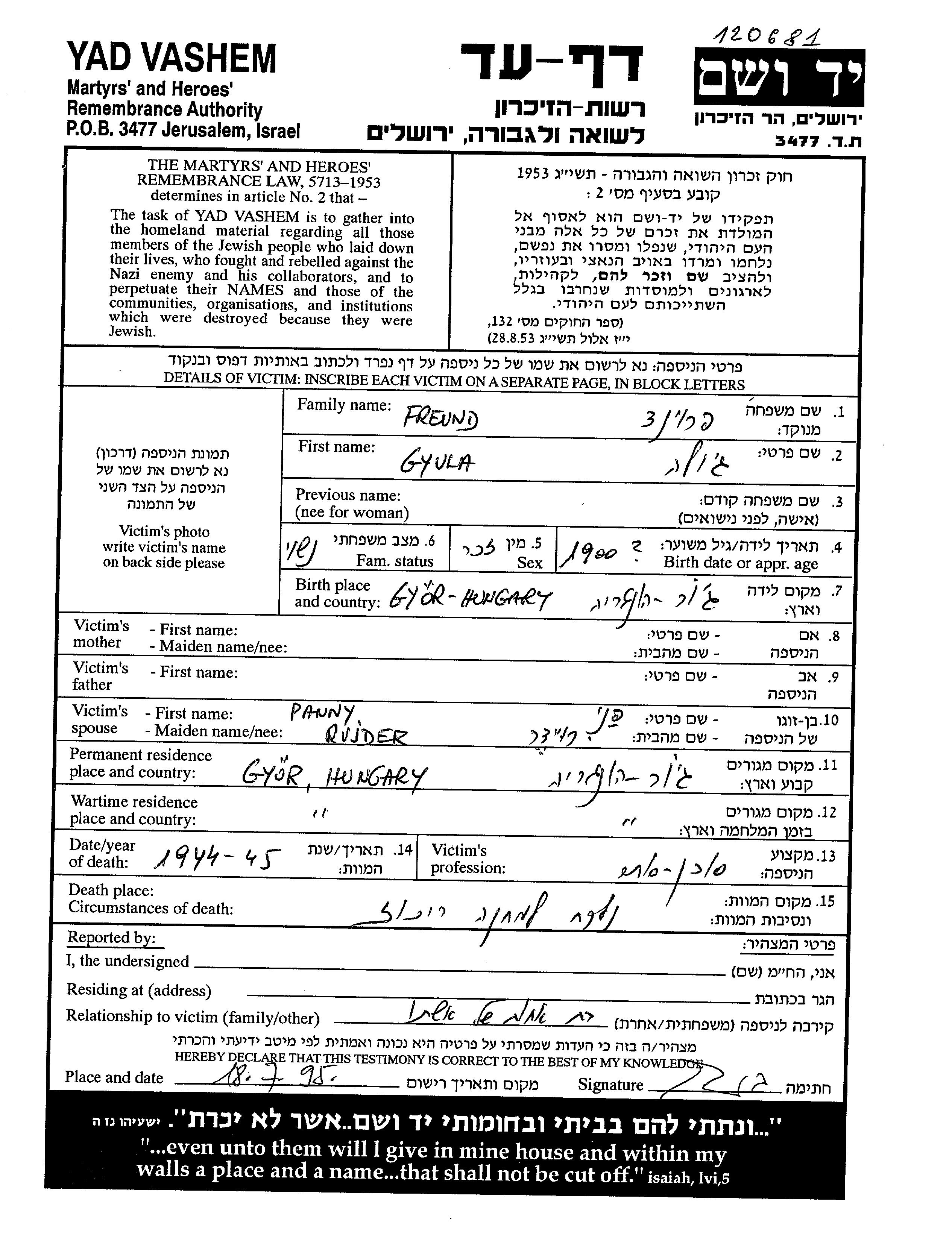 Gyula Freund wurde im Jahr 1900 in Gyor, Ungarn geboren. Er war Vertreter/-in und mit Fanny Verheiratet. Vor dem Zweiten Weltkrieg lebte er in Gyor, Ungarn. Während des Krieges war er in Gyor, Ungarn.