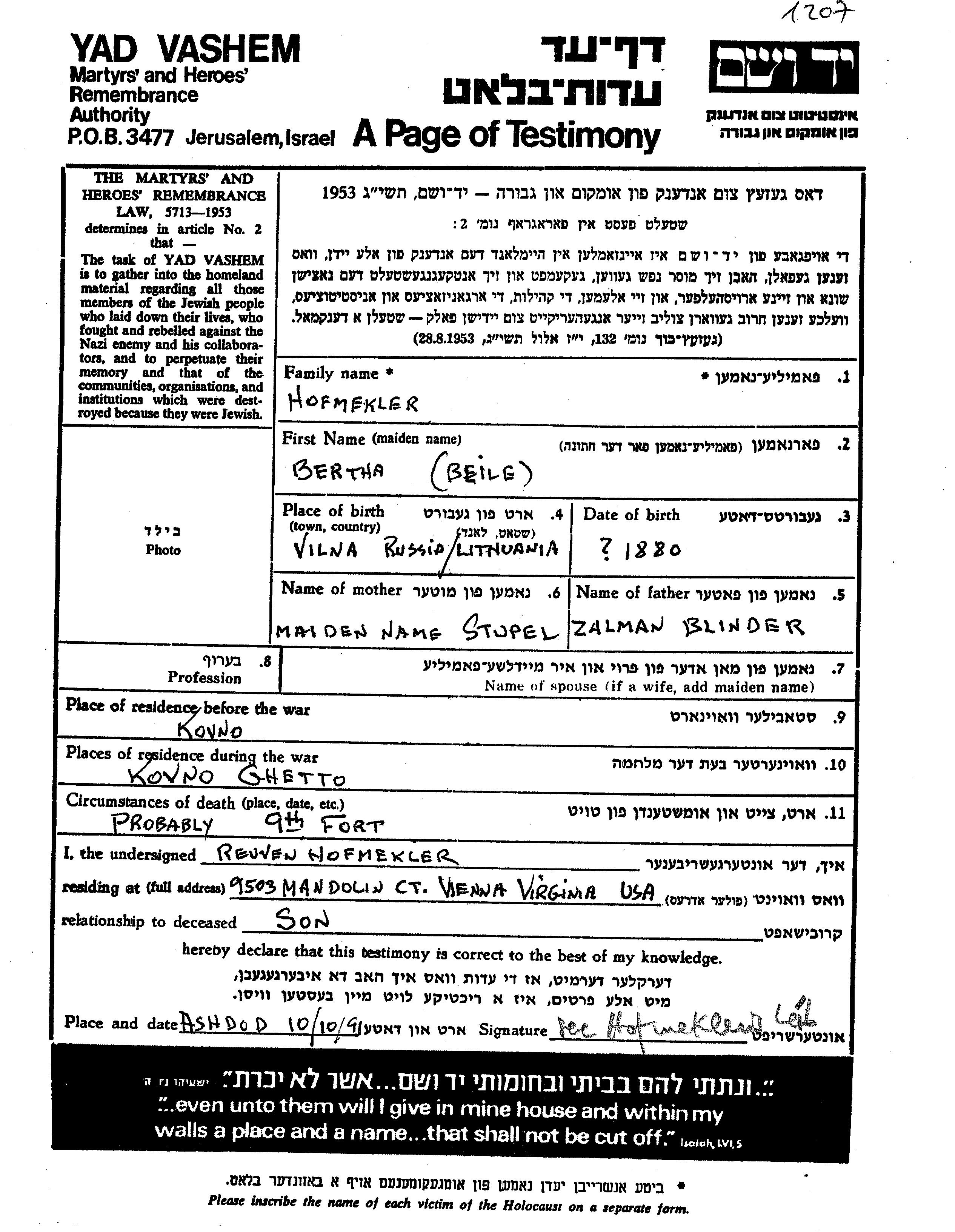 Bertha Beile Hofmekler, geb. Blinder wurde im Jahr 1880 in Wilno, Polen geboren. Sie war die Tochter von Zalman, geb. Stupel Shtupel. Sie war Verheiratet. Vor dem Zweiten Weltkrieg lebte sie in Kaunas, Litauen. Während des Krieges war sie in Kaunas, Litauen.