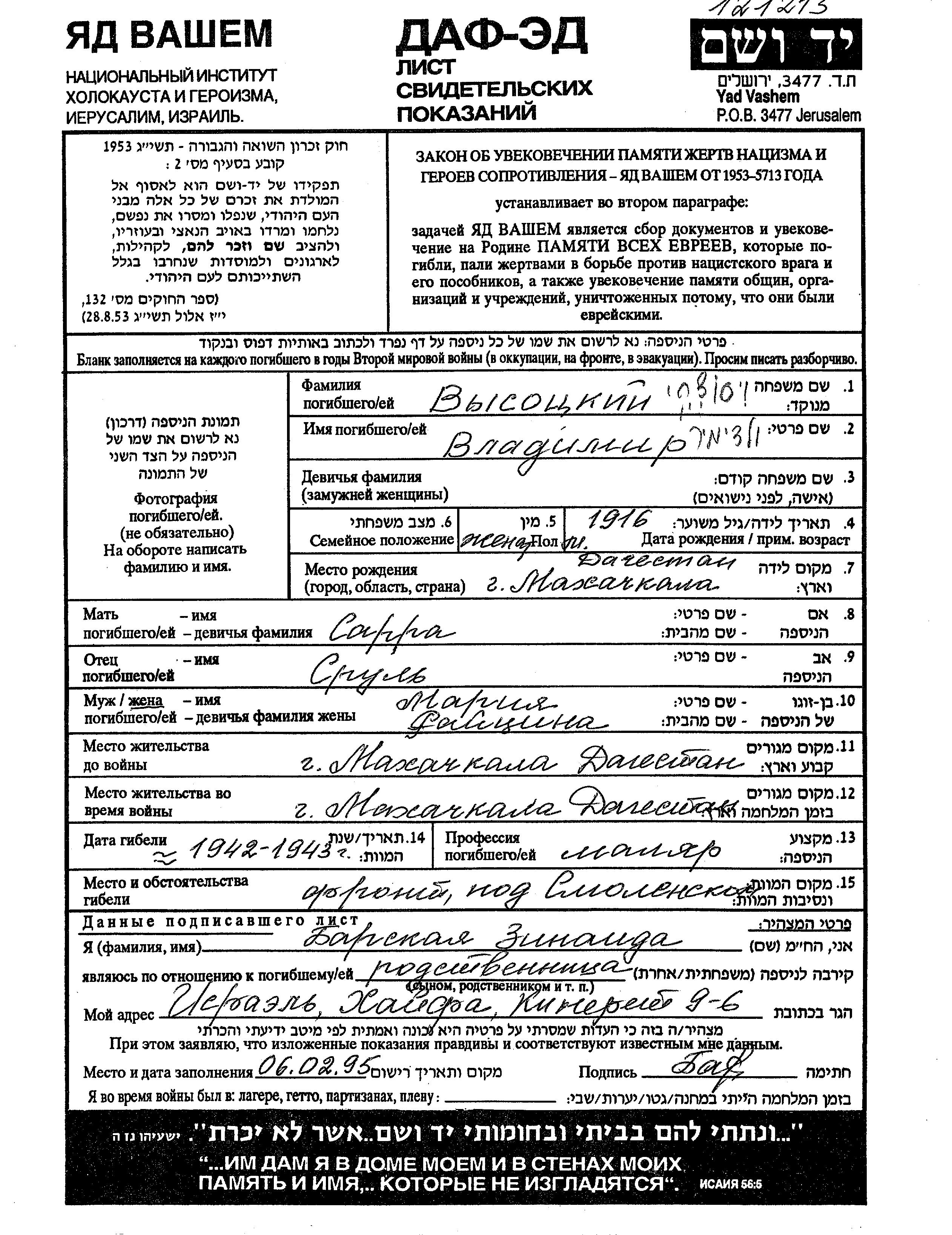 Vladimir Vysotzki wurde im Jahr 1916 in Makhachkala, Russland (UdSSR) geboren. Er war der Sohn von Srul und Sara. Er war Anstreicher/-in und mit Maria Verheiratet. Vor dem Zweiten Weltkrieg lebte er in Makhachkala, Russland (UdSSR). Während des Krieges war er in die Sowjetischen Streitkräfte. Vladimir im Militärdienst umgekommen. Todesort: Smolensk, Russland (UdSSR).