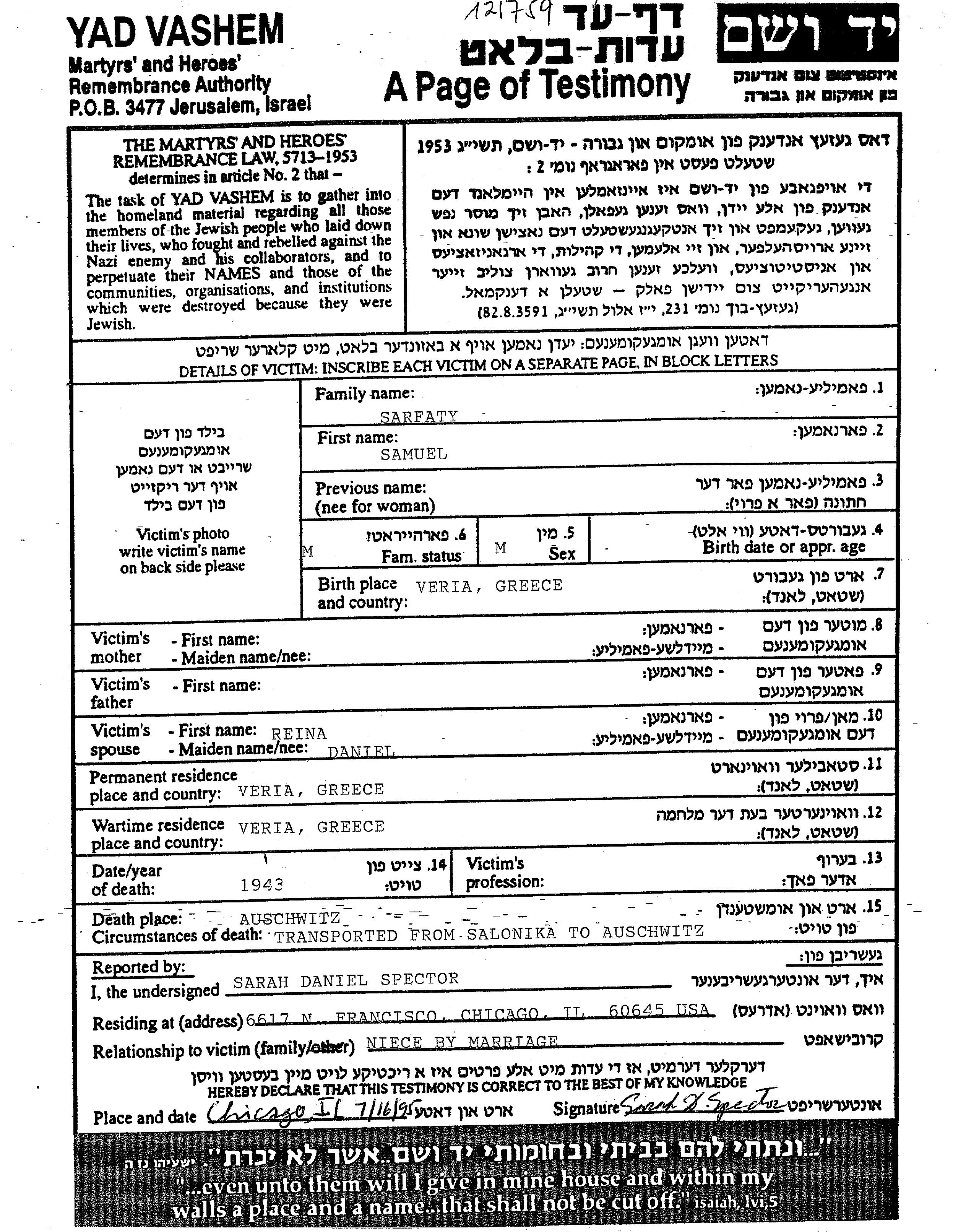 Shmuel Sarfaty wurde in Veria, Griechenland geboren. Er war mit Reina Verheiratet. Vor dem Zweiten Weltkrieg lebte er in Veria, Griechenland. Während des Krieges war er in Saloniki, Griechenland.