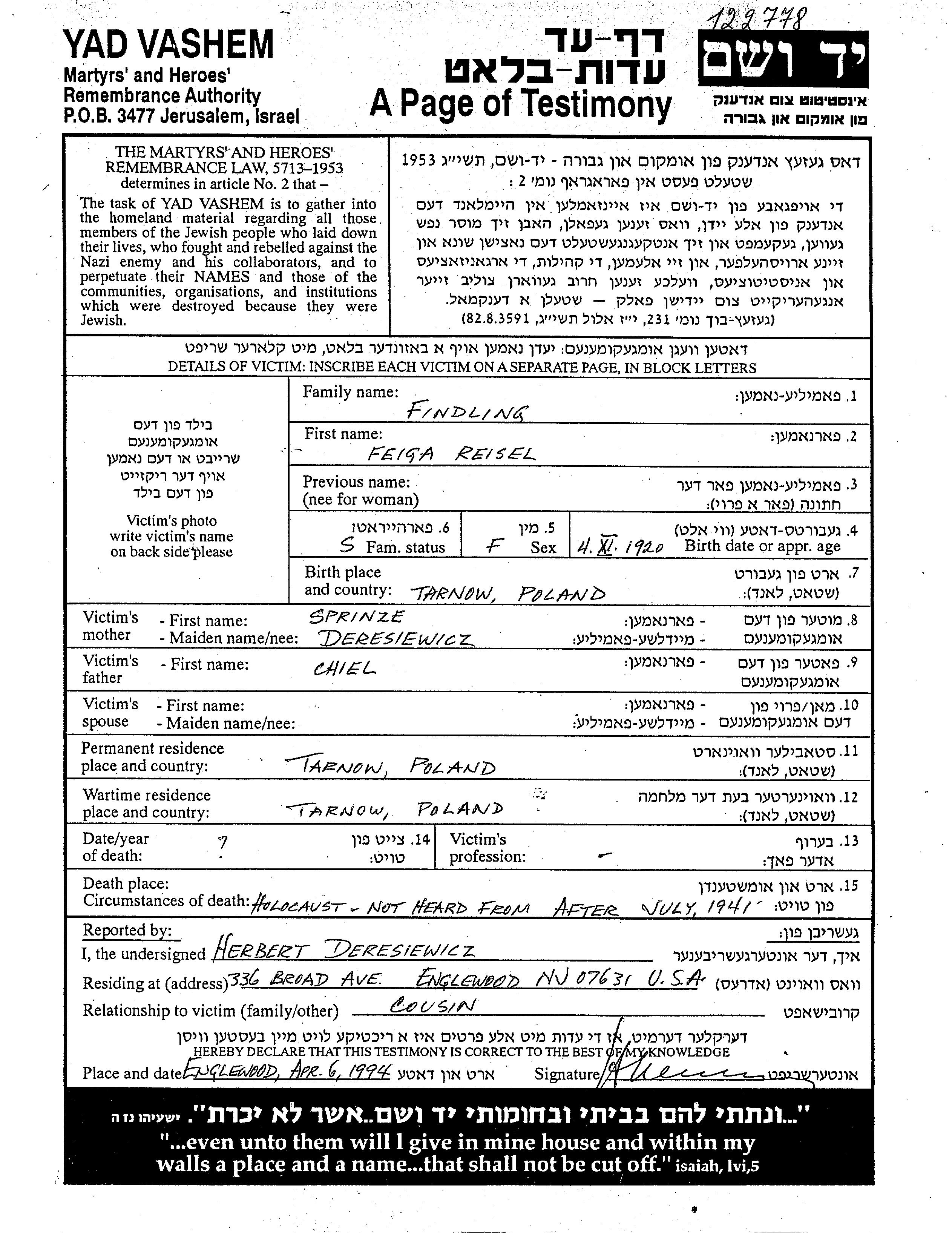 Reisel Feiga Findling wurde im Jahr 1920 in Tarnow, Polen geboren. Sie war die Tochter von Chiel und Sprinze, geb. Deresiewicz. Sie war Ledig. Vor dem Zweiten Weltkrieg lebte sie in Tarnow, Polen. Während des Krieges war sie in Tarnow, Polen.