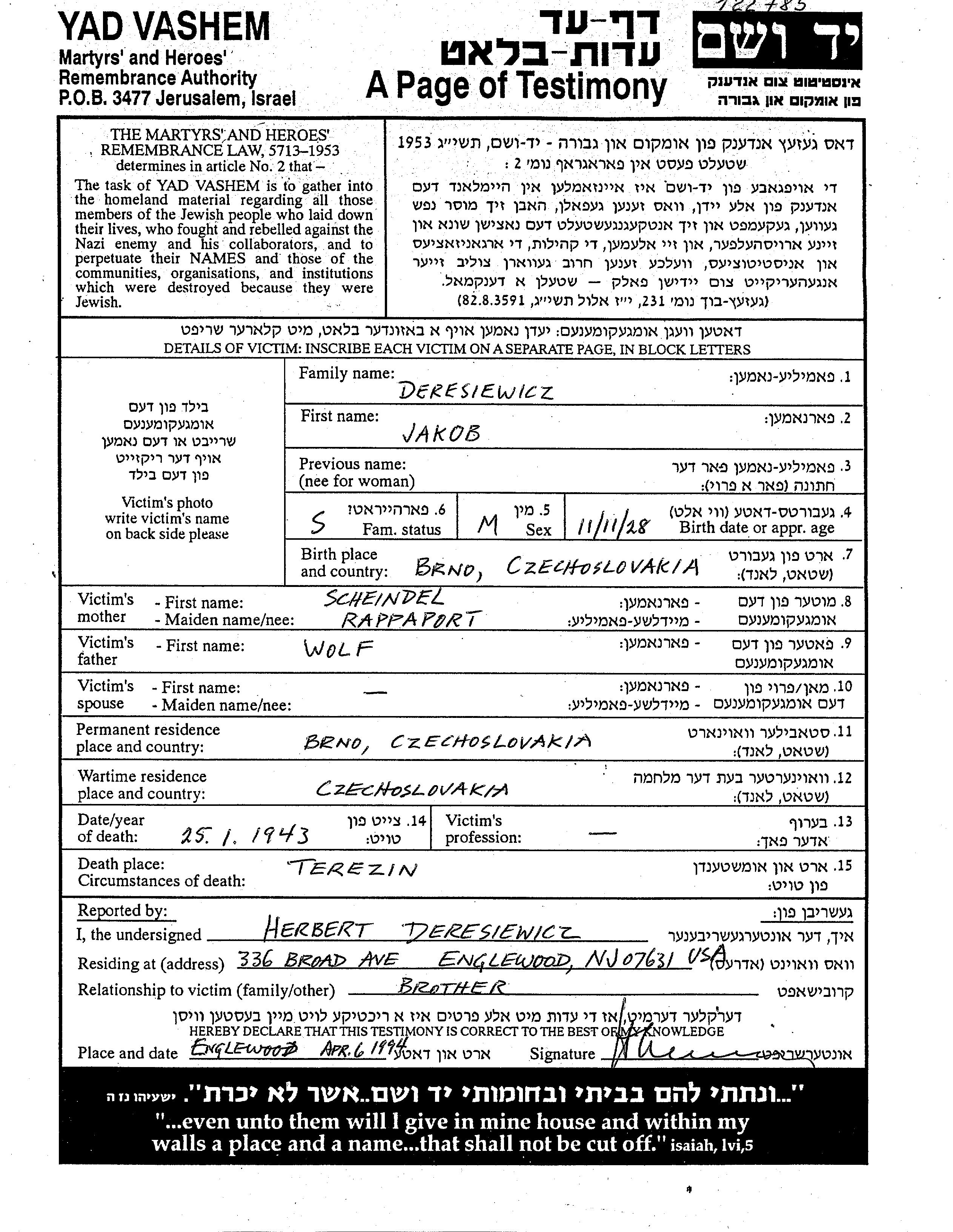 Jakob Deresiewicz wurde im Jahr 1928 in Brno, Tschechoslowakei geboren. Er war der Sohn von Wolf und Scheindel, geb. Rappaport. Er war Kind. Vor dem Zweiten Weltkrieg lebte er in Brno, Tschechoslowakei. Während des Krieges war er in Tschechoslowakei.