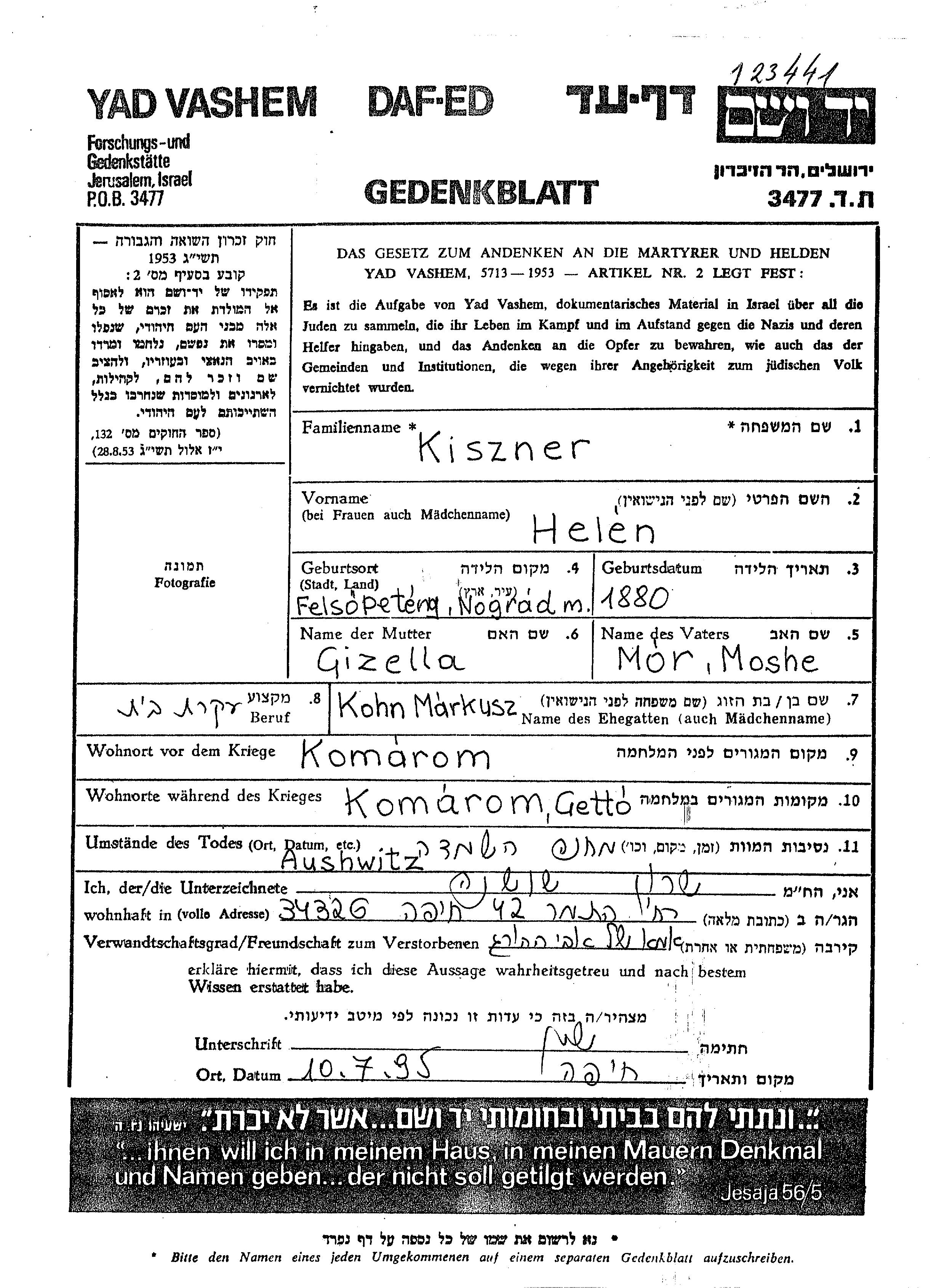 Helen Kiszner Kohn Kun wurde im Jahr 1880 in Felsopeteny, Ungarn geboren. Sie war die Tochter von Mor Moshe und Gizella. Sie war Hausfrau und mit Markusz Verheiratet. Vor dem Zweiten Weltkrieg lebte sie in Komarom, Ungarn. Während des Krieges war sie in Komarom, Ungarn.