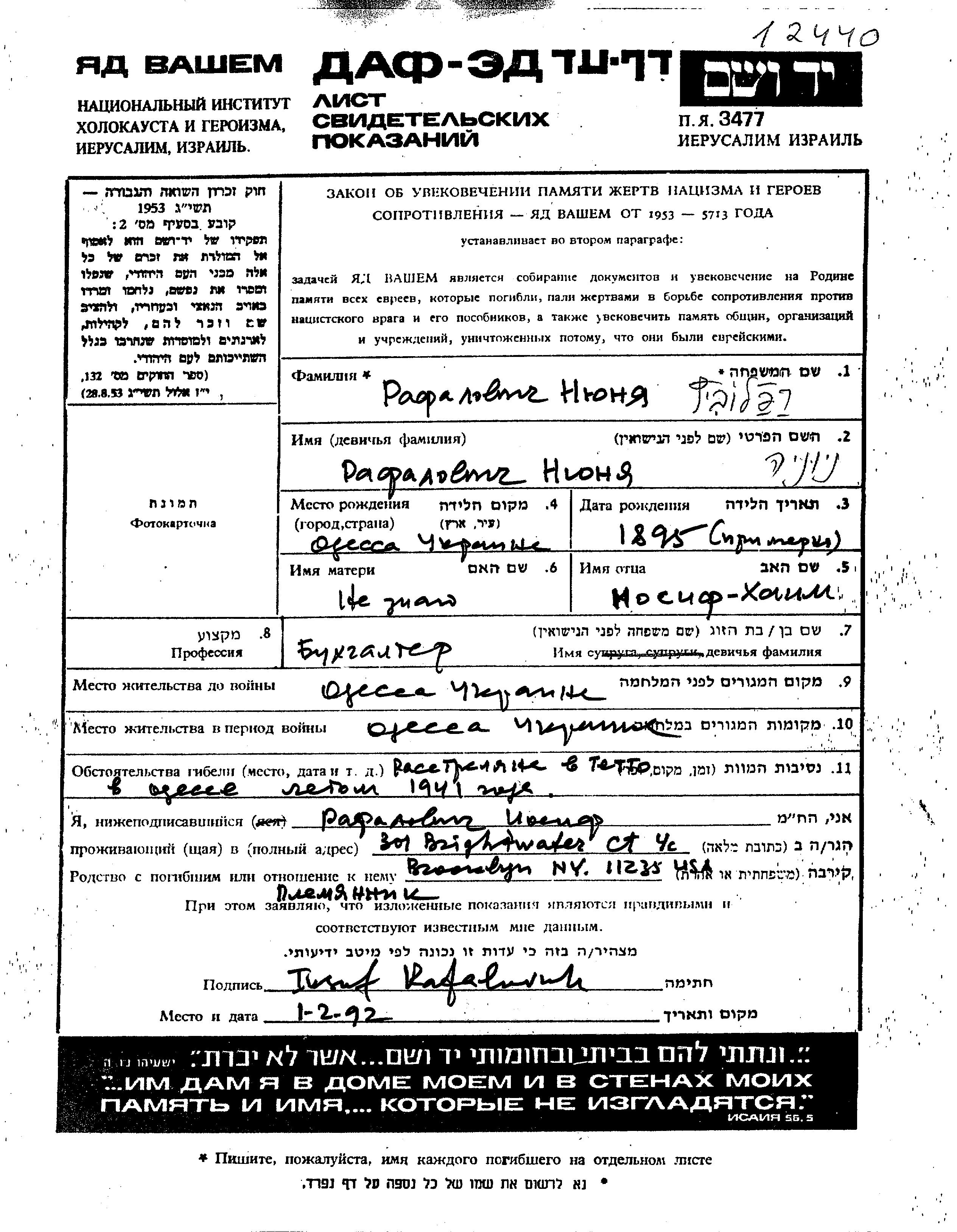 Niunia Rafalovich wurde im Jahr 1895 in Odessa, Ukraine (UdSSR) geboren. Sie war die Tochter von Iosif Khaim. Sie war Buchhalter/-in. Vor dem Zweiten Weltkrieg lebte sie in Odessa, Ukraine (UdSSR). Während des Krieges war sie in Odessa, Ukraine (UdSSR).