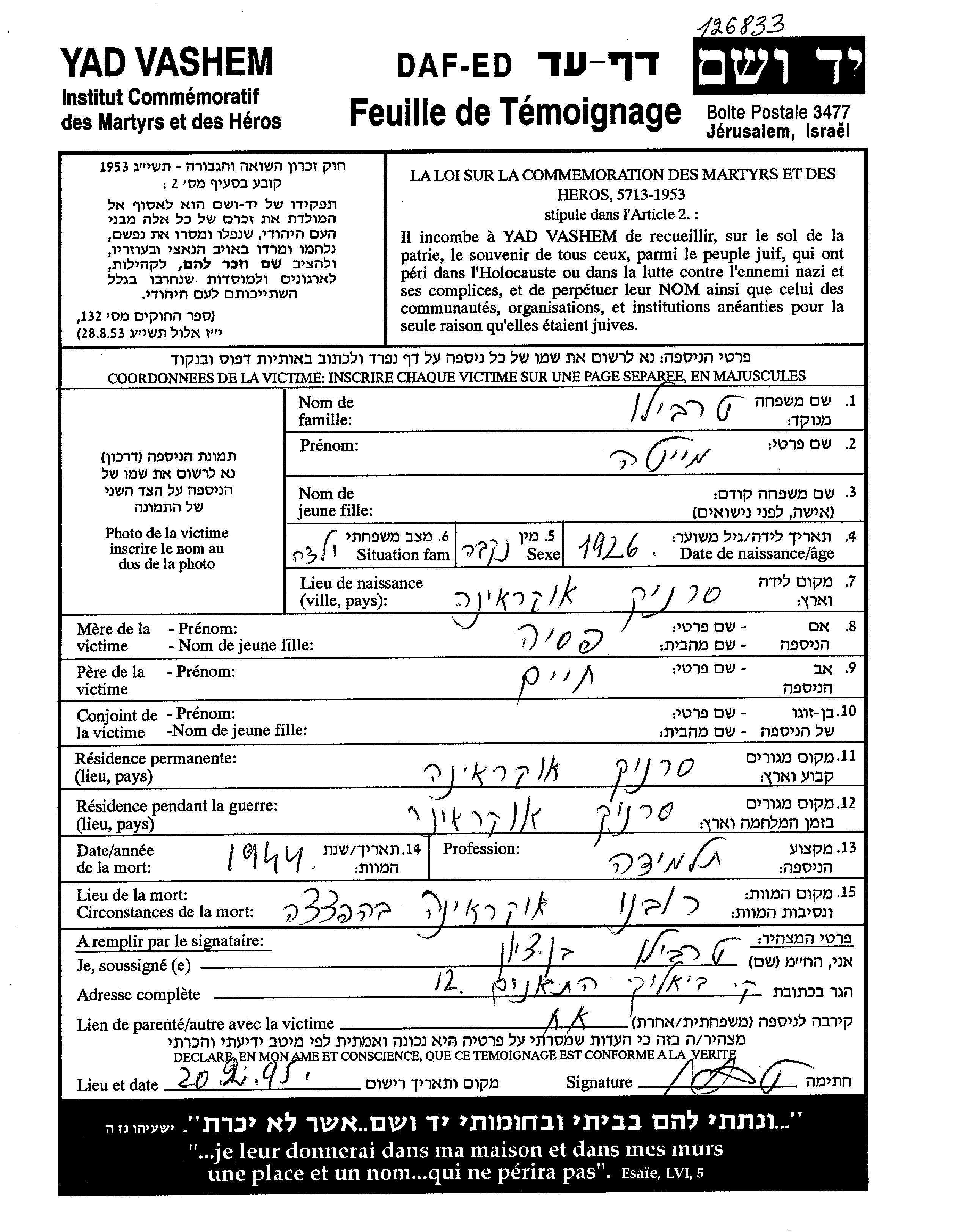 Meita Terebilo wurde im Jahr 1926 in Sarnki, Polen geboren. Sie war die Tochter von Khaim und Pesia. Sie war Schüler/-in und Ledig. Vor dem Zweiten Weltkrieg lebte sie in Sarnki, Polen. Während des Krieges war sie in Sarnki, Polen.