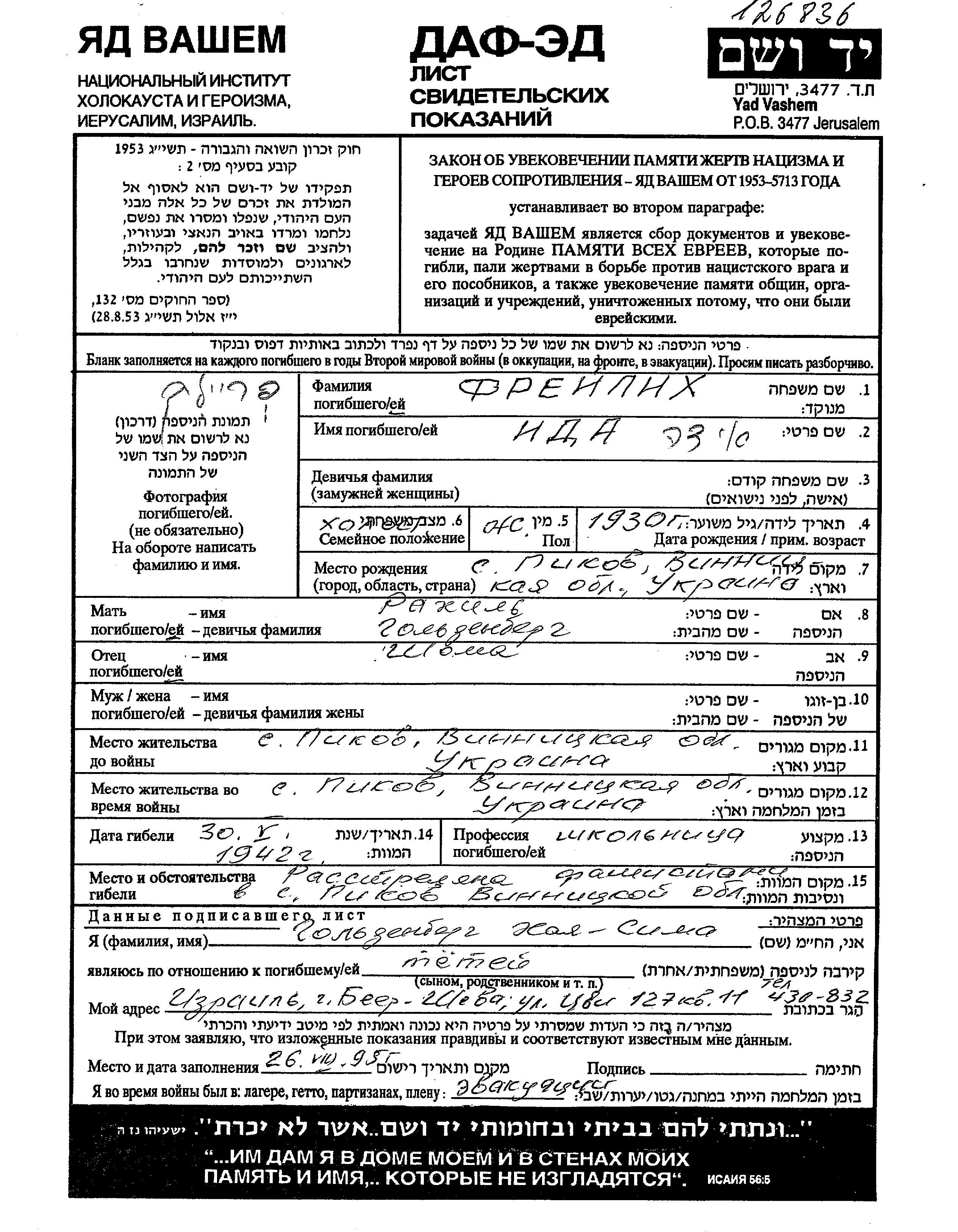Ida Freilikh wurde im Jahr 1930 in Pikov, Ukraine (UdSSR) geboren. Sie war die Tochter von Shoma und Rakhil, geb. Goldenberg. Sie war Schneider und Kind. Vor dem Zweiten Weltkrieg lebte sie in Pikov, Ukraine (UdSSR). Während des Krieges war sie in Pikov, Ukraine (UdSSR).