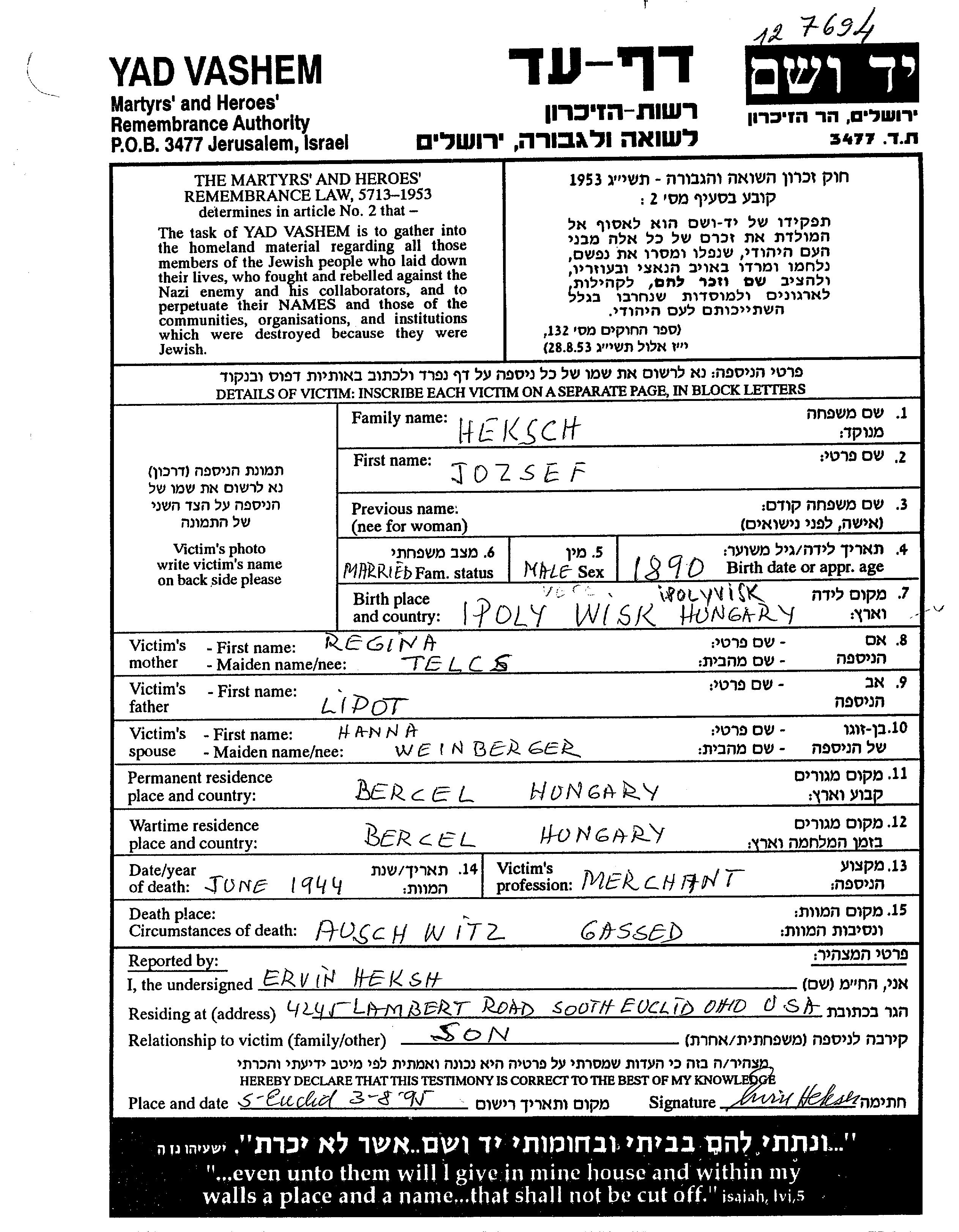 Jozsef Heksch wurde im Jahr 1890 in Ipolyvisk, Tschechoslowakei geboren. Er war der Sohn von Lipot und Regina, geb. Telcs. Er war Kaufmann/-frau und mit Hanna Verheiratet. Vor dem Zweiten Weltkrieg lebte er in Bercel, Ungarn. Während des Krieges war er in Bercel, Ungarn.