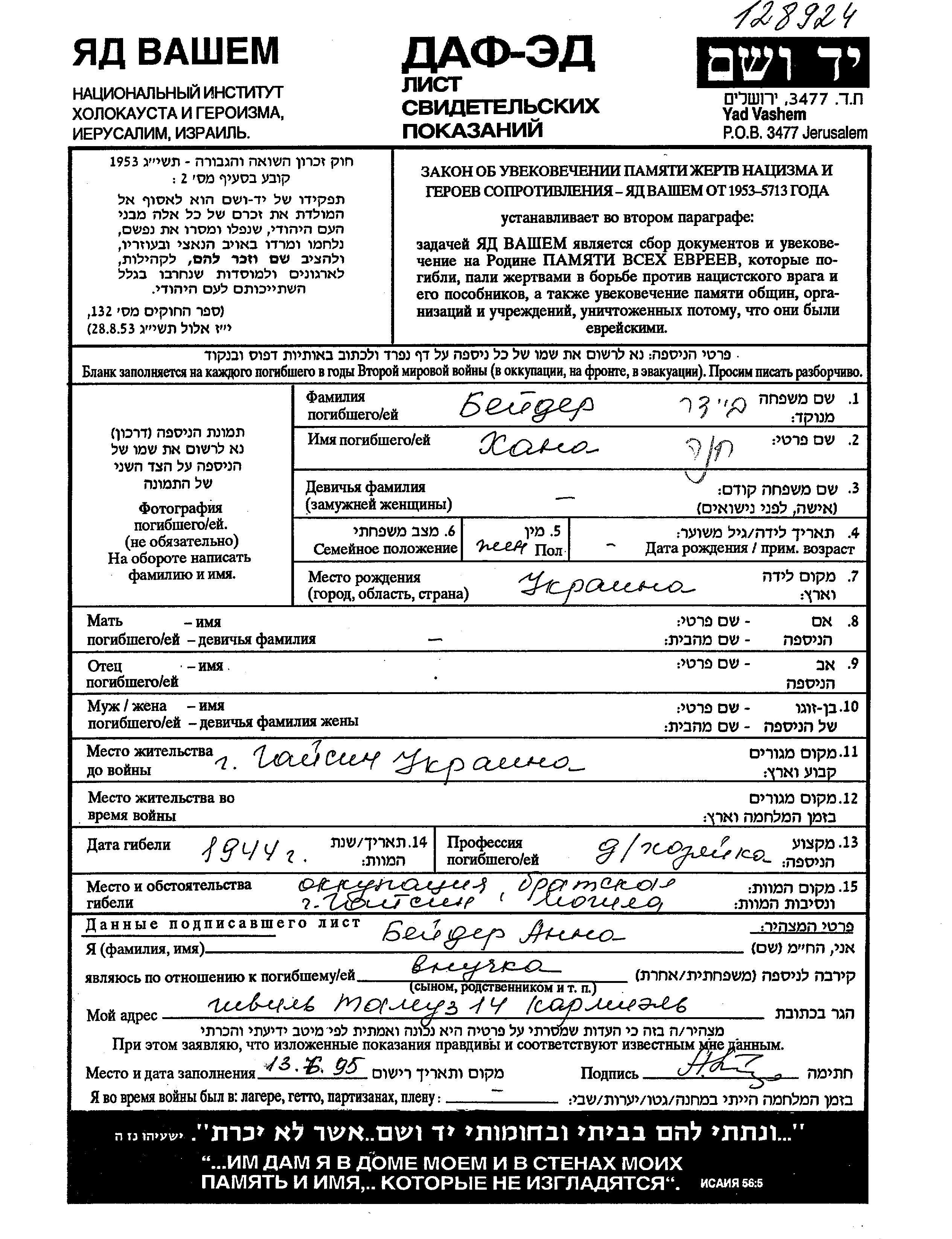 Khana Beider wurde in Ukraine (UdSSR) geboren. Sie war Hausfrau. Vor dem Zweiten Weltkrieg lebte sie in Gaysin, Ukraine (UdSSR). Während des Krieges war sie in Gaysin, Ukraine (UdSSR).