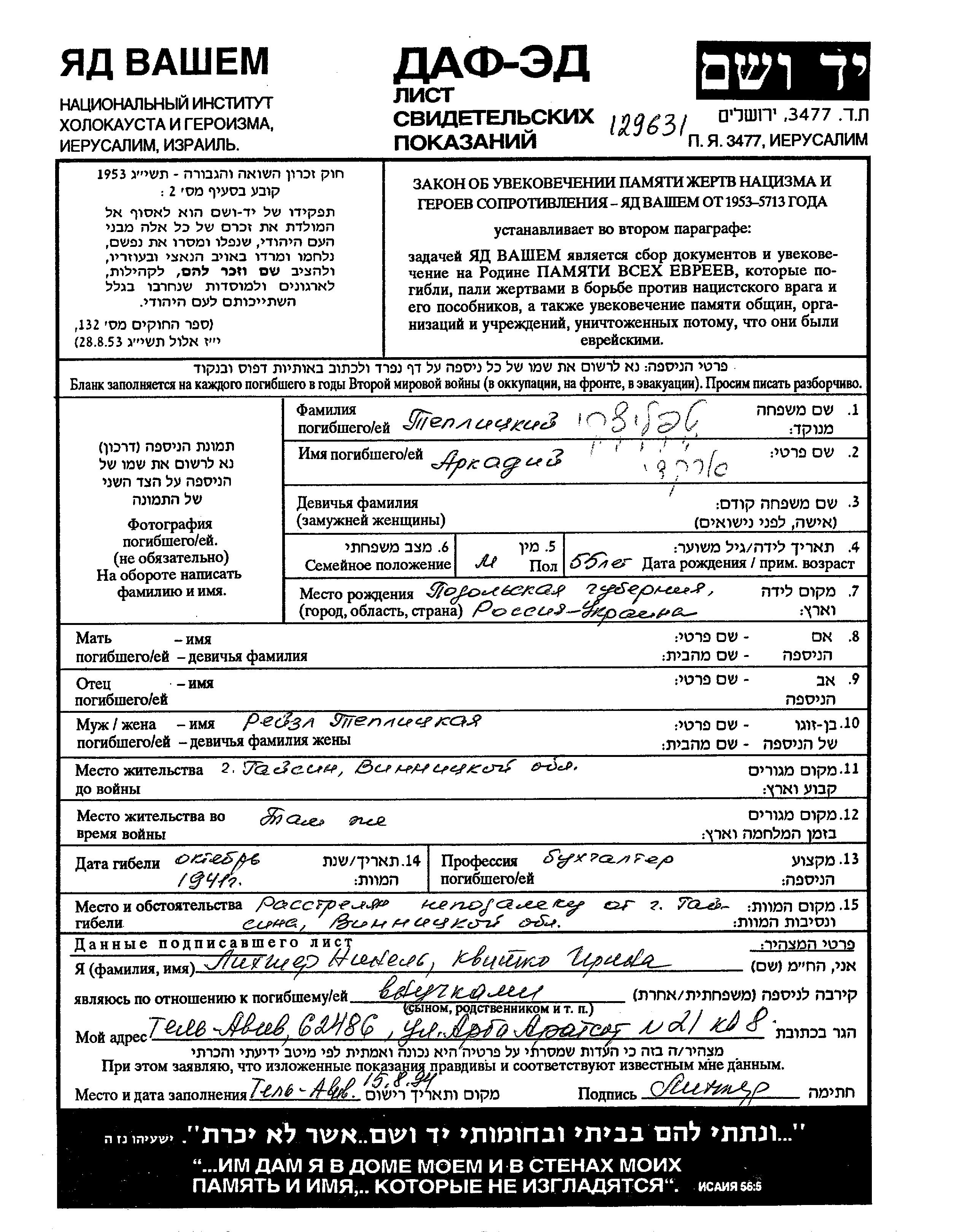 Arkadi Teplitzki wurde im Jahr 1886 in Vinnitsa, Ukraine (UdSSR) geboren. Er war Buchhalter/-in und mit Reizl Verheiratet. Vor dem Zweiten Weltkrieg lebte er in Gaysin, Ukraine (UdSSR). Während des Krieges war er in Gaysin, Ukraine (UdSSR).