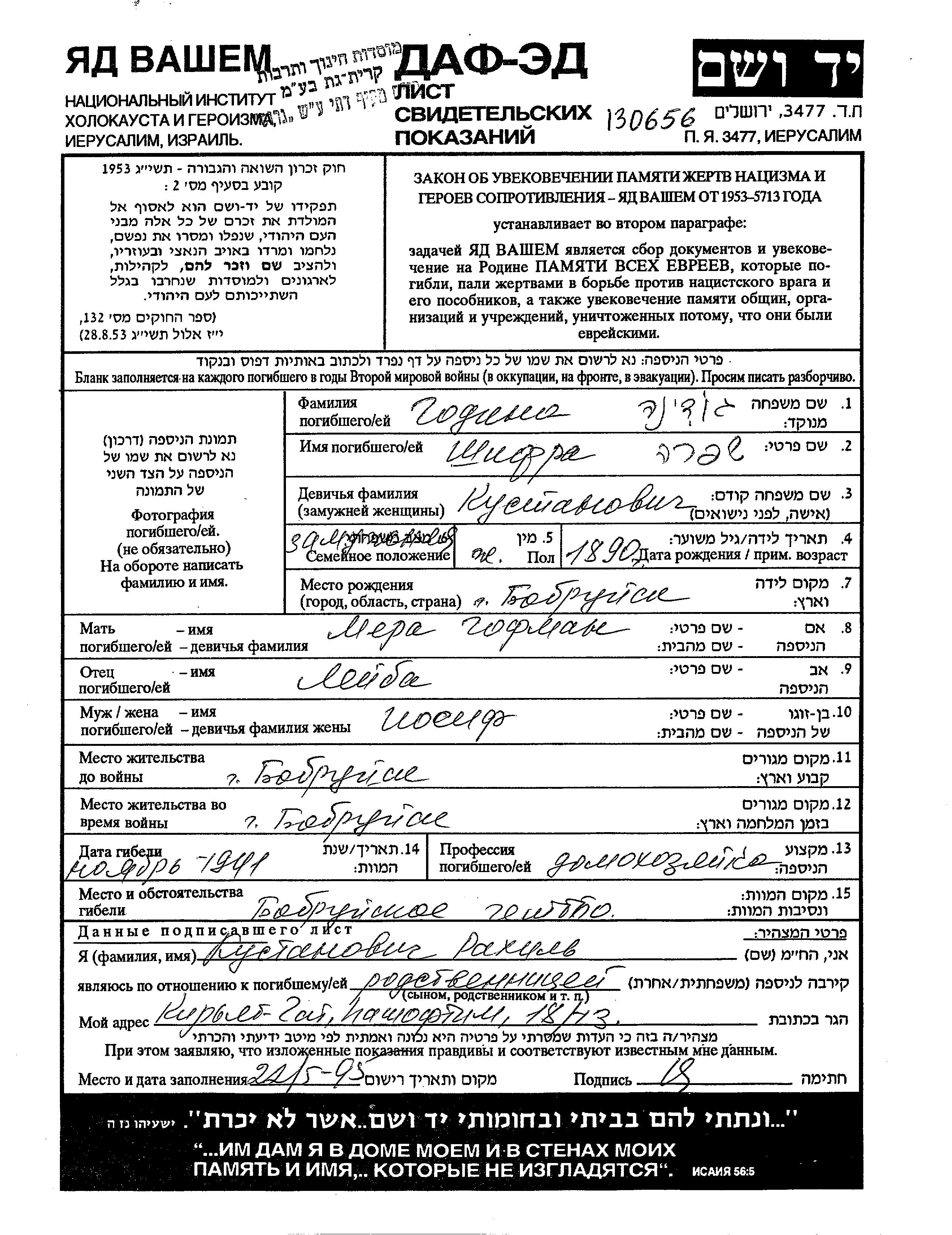 Shifra Godin, geb. Kustanovich wurde im Jahr 1890 in Bobruysk, Weißrussland (UdSSR) geboren. Sie war die Tochter von Leiba und Mera, geb. Gofman. Sie war Hausfrau und mit Iosif Verheiratet. Vor dem Zweiten Weltkrieg lebte sie in Bobruysk, Weißrussland (UdSSR). Während des Krieges war sie in Bobruysk, Weißrussland (UdSSR).
