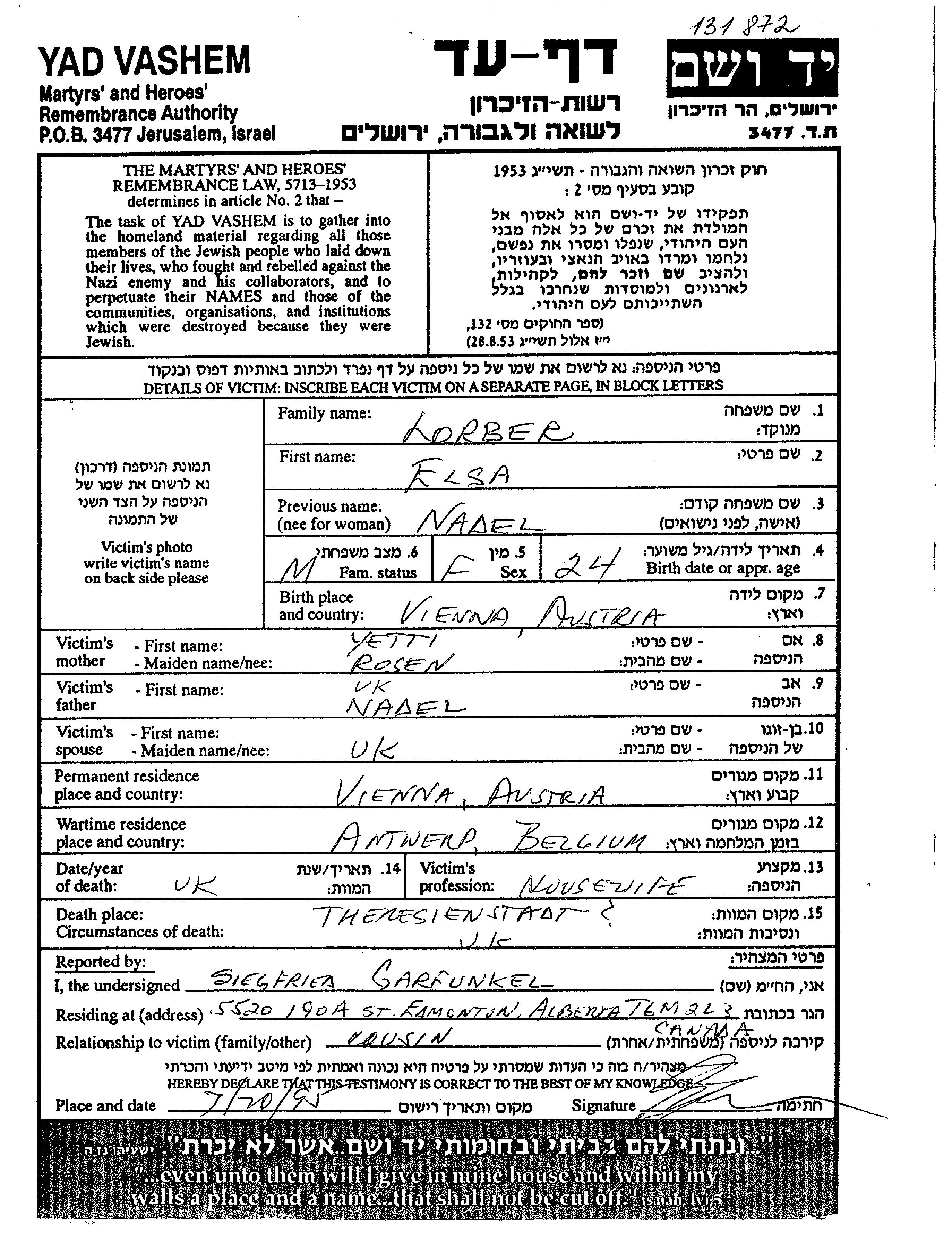 Elsa Lorber, geb. Nadel wurde in Wien, Österreich geboren. Sie war die Tochter von Adolf und Yetti, geb. Rosen. Sie war Hausfrau und Verheiratet. Vor dem Zweiten Weltkrieg lebte sie in Wien, Österreich. Während des Krieges war sie in Antwerpen, Belgien.