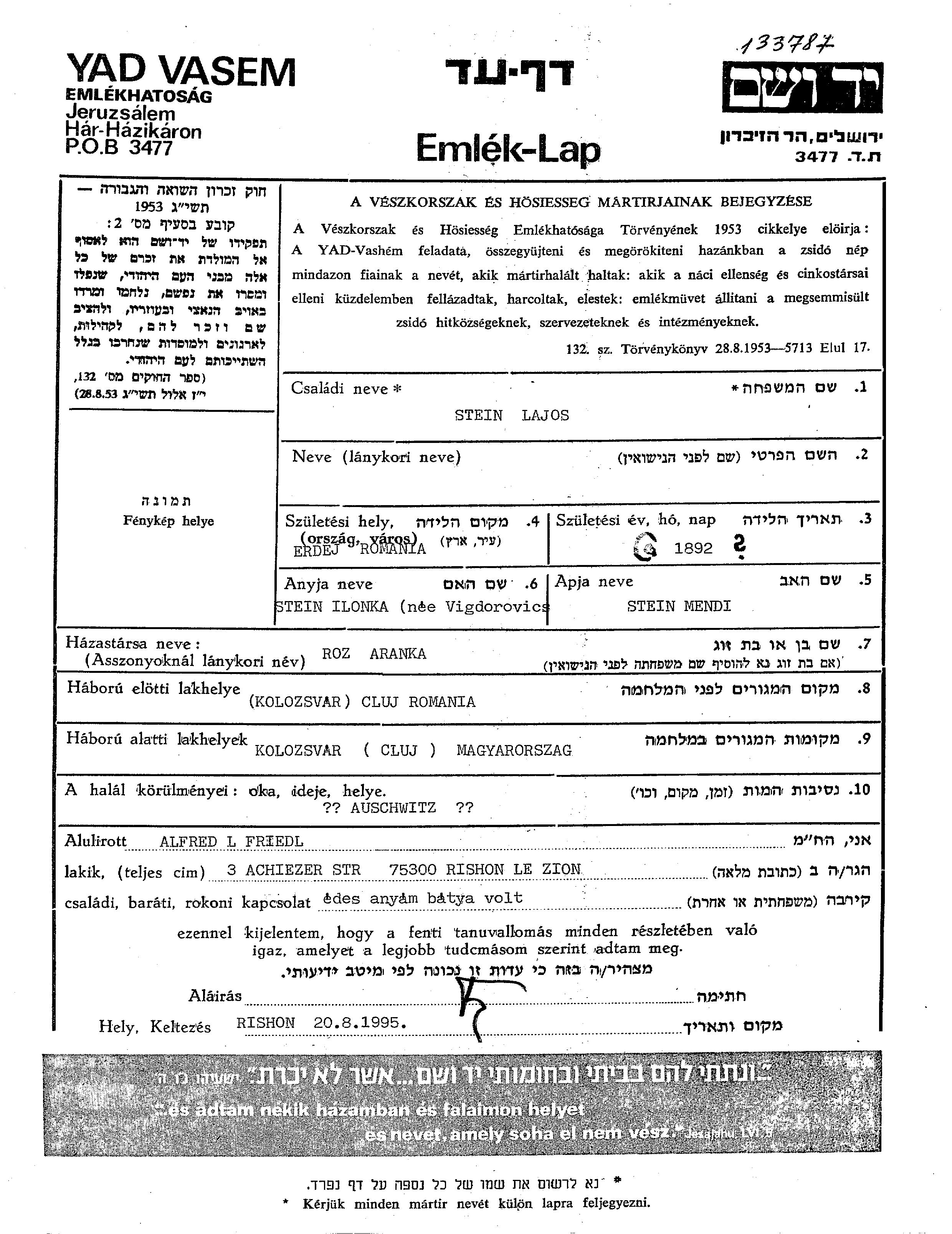 Lajos Stein wurde im Jahr 1892 in Transylvania, Rumänien geboren. Er war der Sohn von Mendi und Ilonka, geb. Vigdorovics. Er war mit Aranka Verheiratet. Vor dem Zweiten Weltkrieg lebte er in Cluj, Rumänien. Während des Krieges war er in Cluj, Rumänien.
