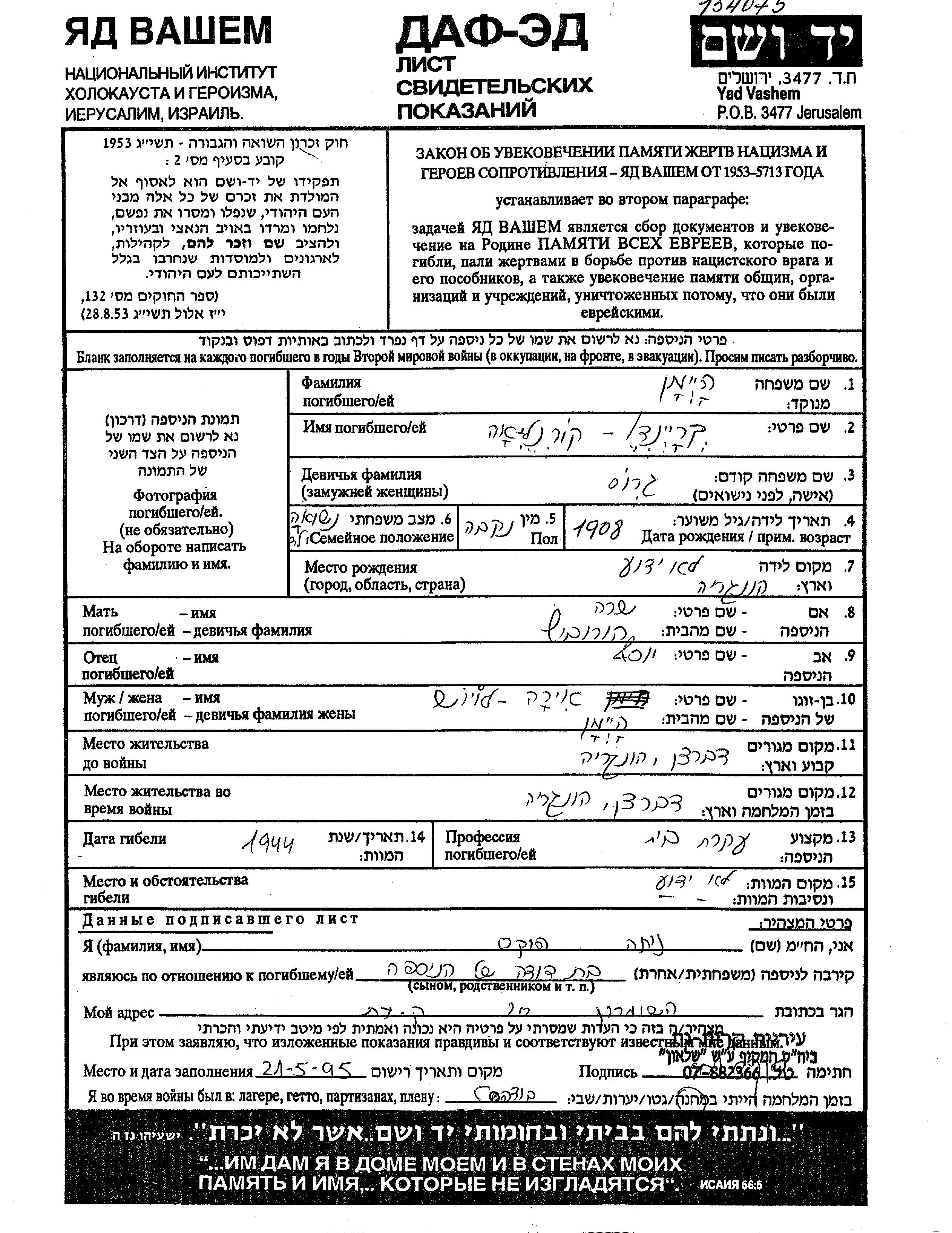 Kreindel Kornelia wurde in der Schoah ermordet. Todesort: unbekannt im Jahr 1944.