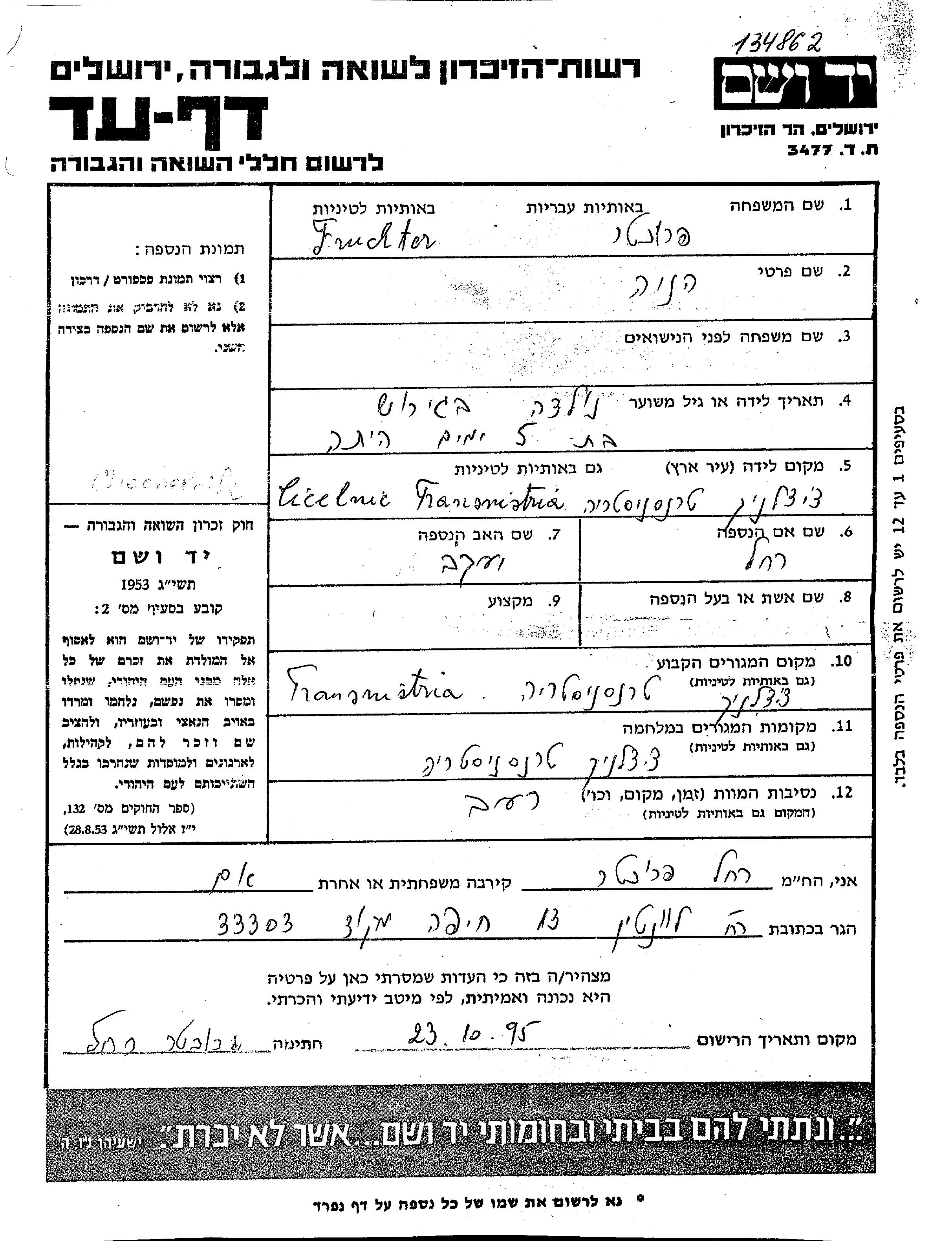 Henia Fruchter wurde in Chechelnik, Ukraine (UdSSR) geboren. Sie war die Tochter von Yaakov und Rakhel. Sie war Kind. Vor dem Zweiten Weltkrieg lebte sie in Chechelnik, Ukraine (UdSSR). Während des Krieges war sie in Chechelnik, Ukraine (UdSSR).
