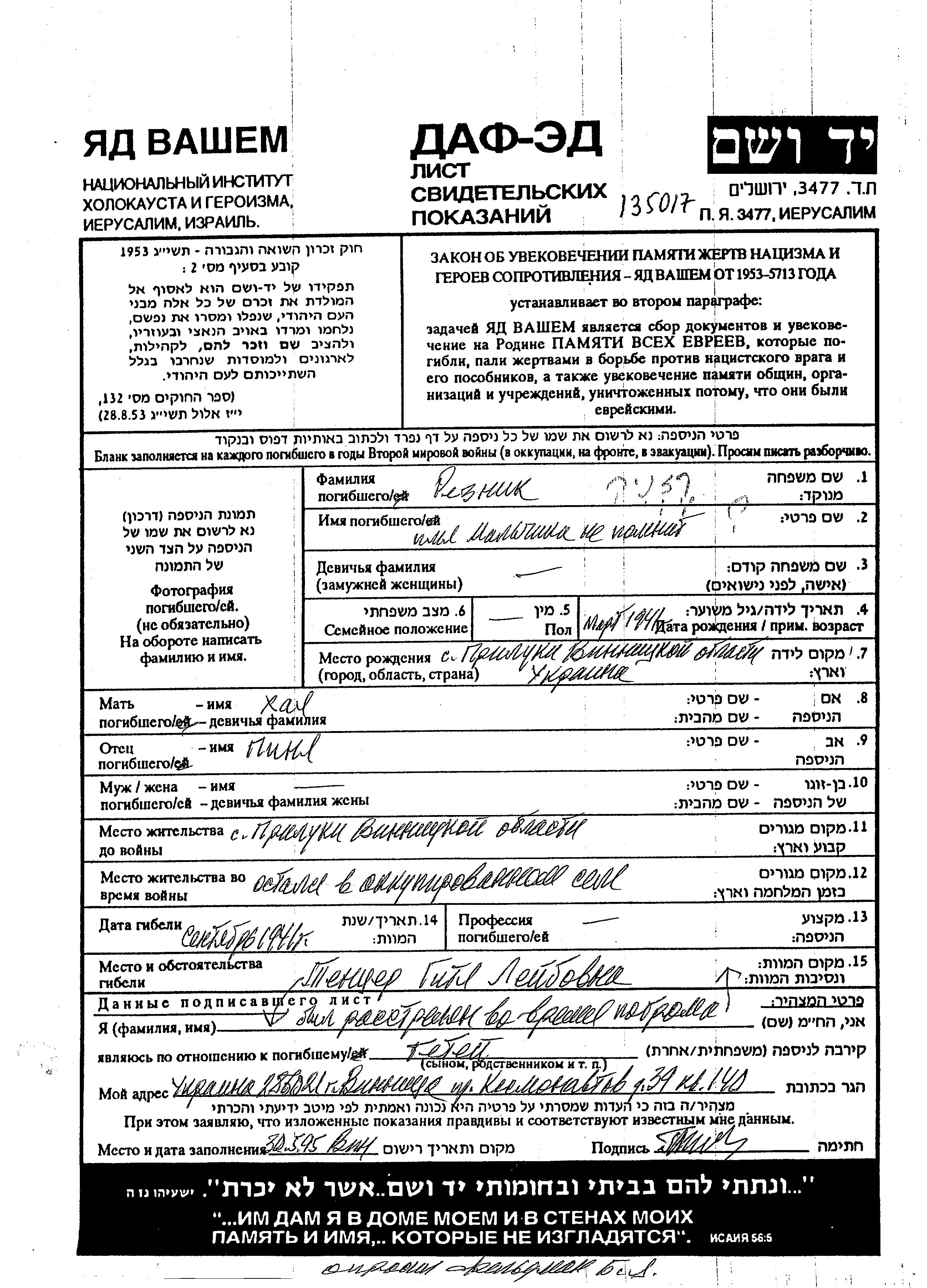 Vorname unbekannt Reznik wurde im Jahr 1941 in Priluki, Ukraine (UdSSR) geboren. Er war der Sohn von Pinia und Khaia. Er war Kind. Vor dem Zweiten Weltkrieg lebte er in Priluki, Ukraine (UdSSR). Während des Krieges war er in Priluki, Ukraine (UdSSR).