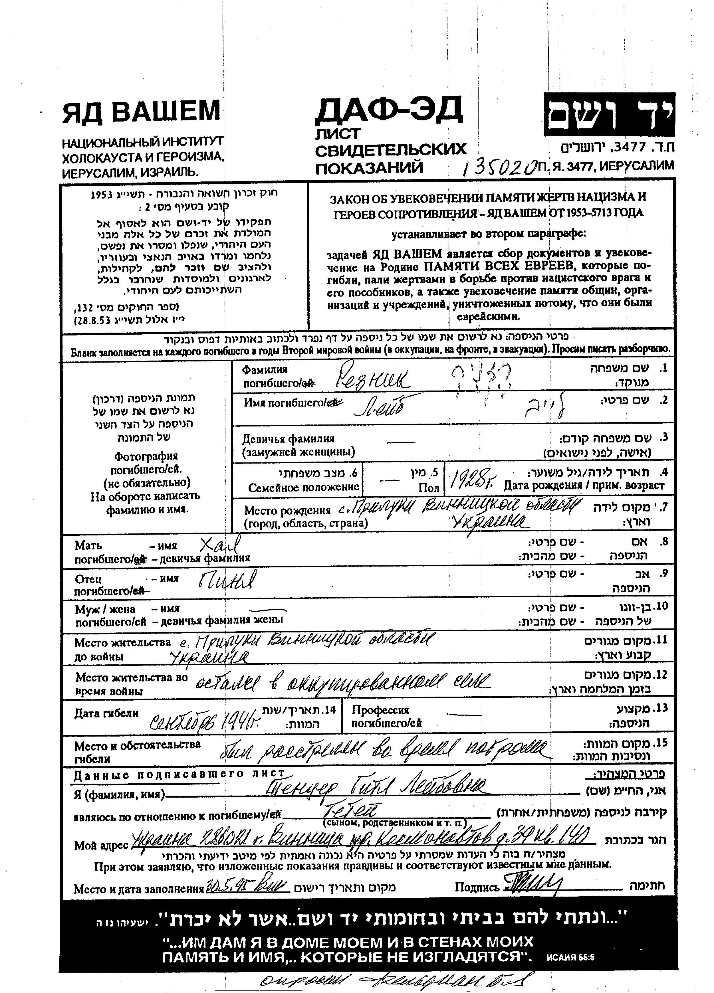 Leib Reznik wurde im Jahr 1928 in Priluki, Ukraine (UdSSR) geboren. Er war der Sohn von Pinia und Khaia. Er war Kind. Vor dem Zweiten Weltkrieg lebte er in Priluki, Ukraine (UdSSR). Während des Krieges war er in Priluki, Ukraine (UdSSR).