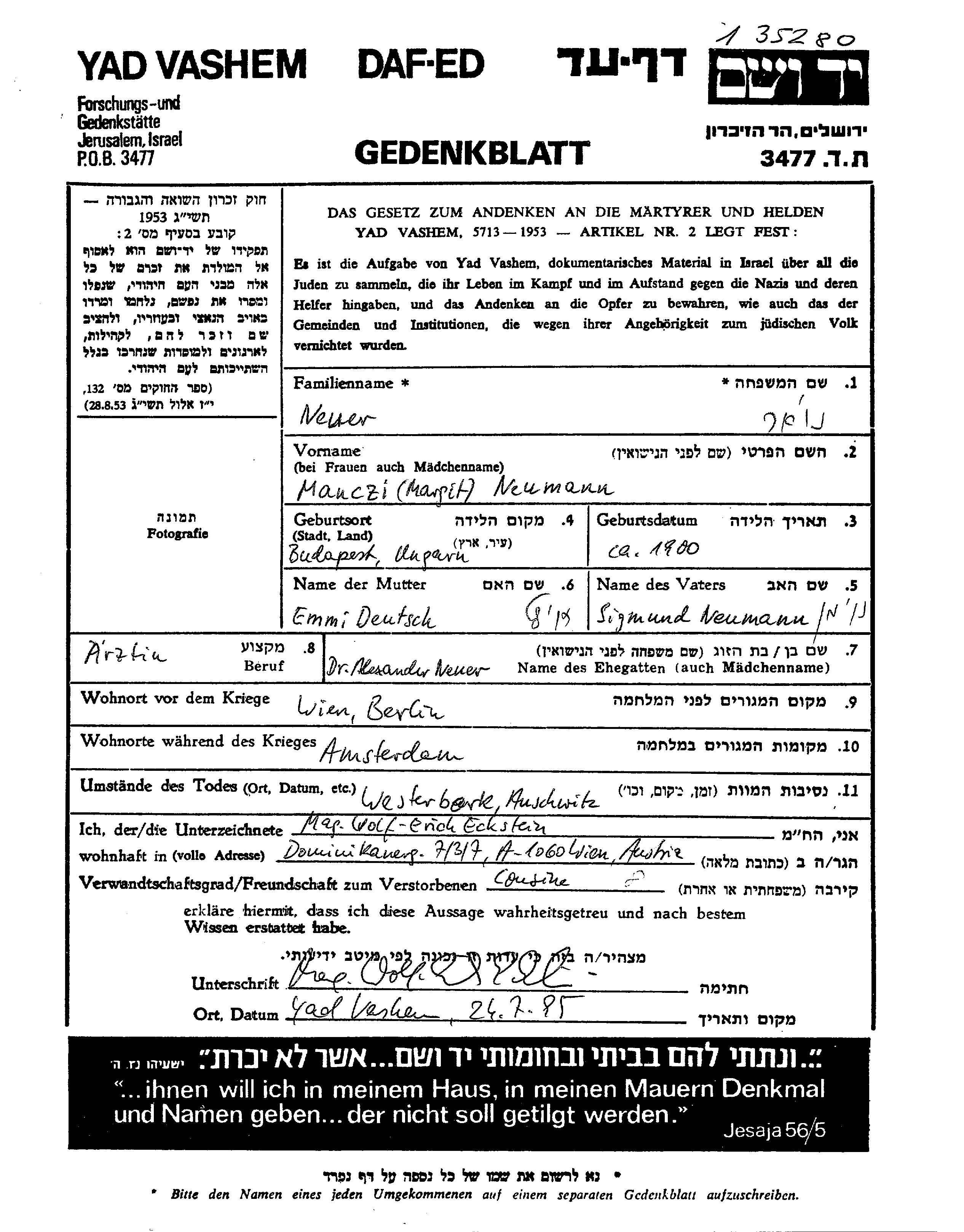 Manczi Margit Neuer, geb. Neumann wurde im Jahr 1900 in Budapest, Ungarn geboren. Sie war die Tochter von Zigmund und Emmi Emi, geb. Deutsch. Sie war Arzt/ärztin und mit Alexander Verheiratet. Vor dem Zweiten Weltkrieg lebte sie in Wien, Österreich. Während des Krieges war sie in Amsterdam, Niederlande.