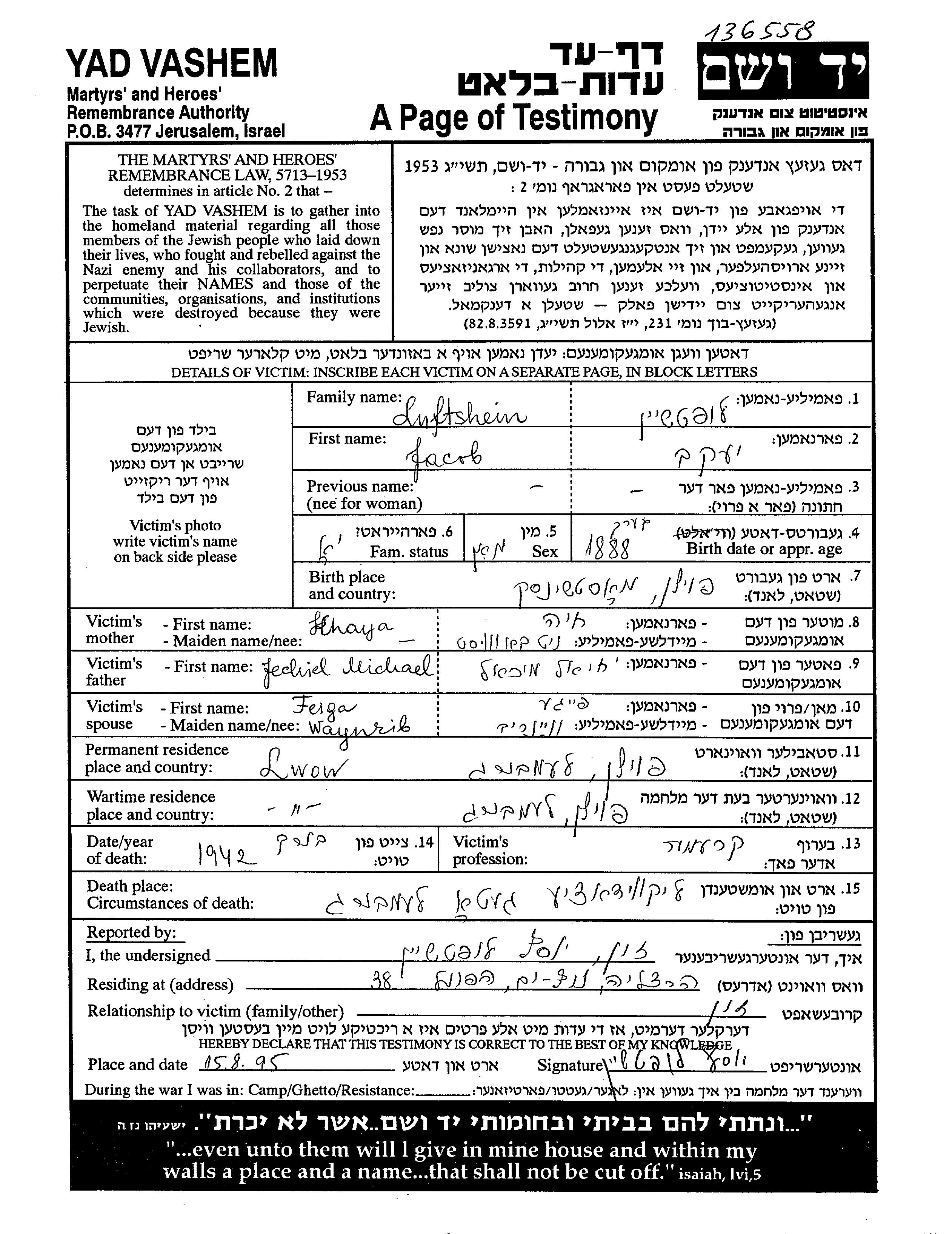 Jacob wurde in der Schoah ermordet. Todesort: Lemberg, Polen im Jahr 1942.