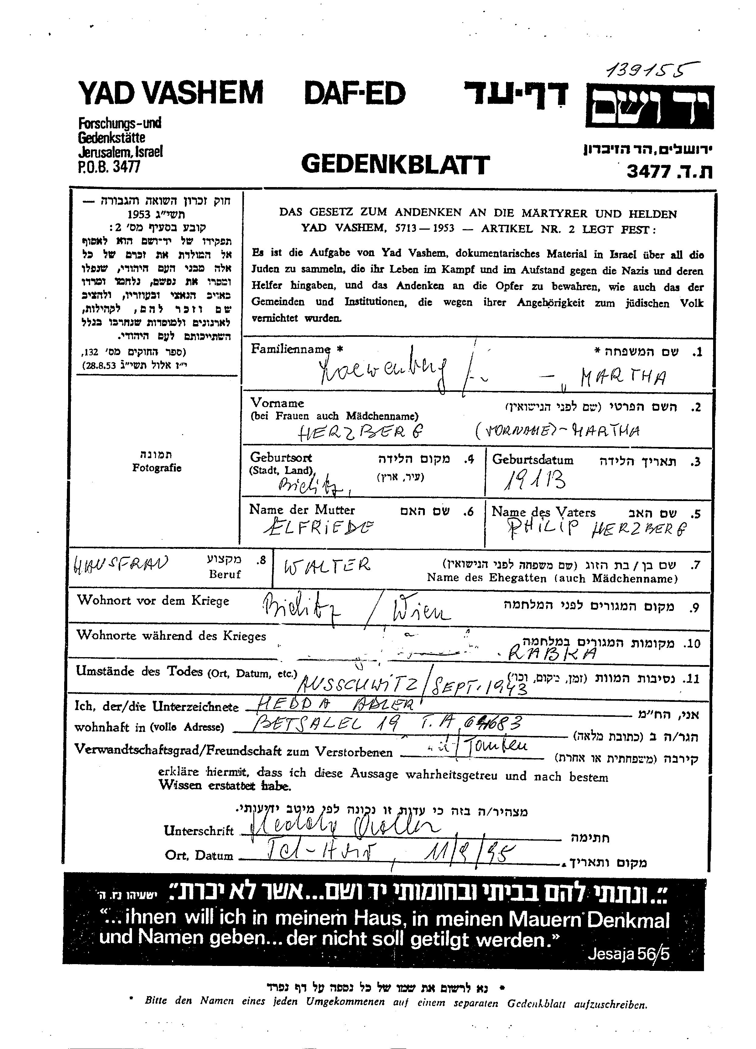 Marta Löwenberg, geb. Herzberg wurde im Jahr 1913 in Bielitz, Polen geboren. Sie war die Tochter von Fhilip und Elfriede. Sie war Hausfrau und mit Walter Verheiratet. Vor dem Zweiten Weltkrieg lebte sie in Bielitz, Polen. Während des Krieges war sie in Wien, Österreich.