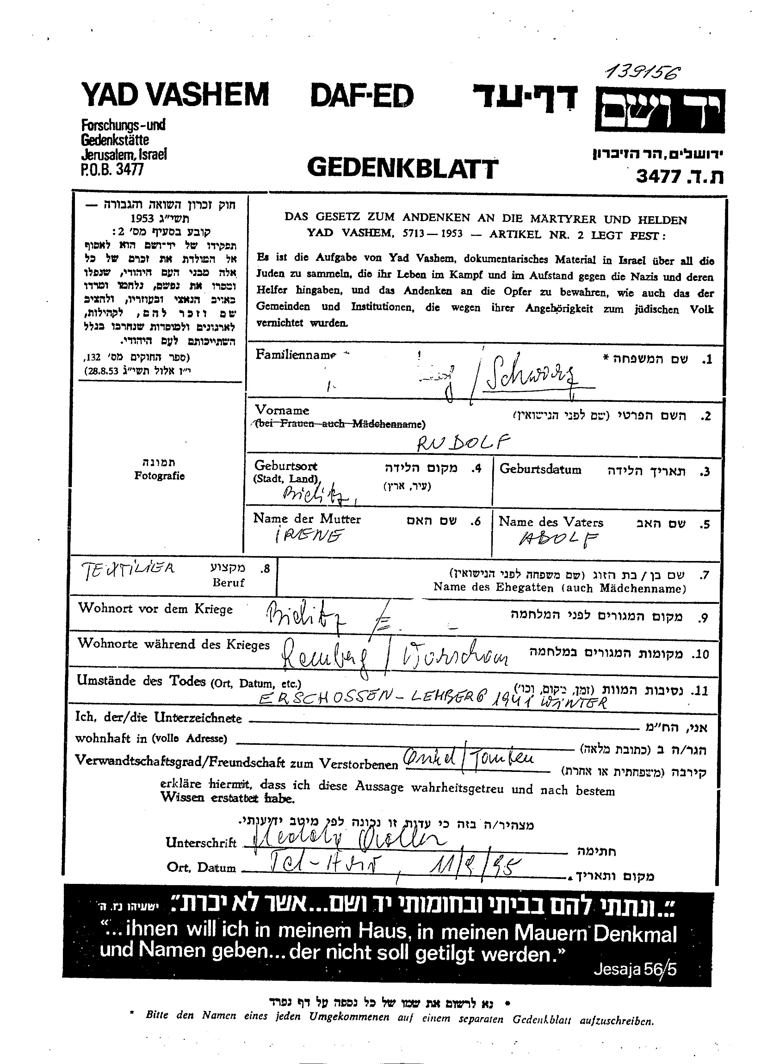 Rudolf Schwarz wurde in Bielitz, Polen geboren. Er war der Sohn von Adolf und Irene. Er war Handwerker. Vor dem Zweiten Weltkrieg lebte er in Bielitz, Polen. Während des Krieges war er in Lemberg, Polen.