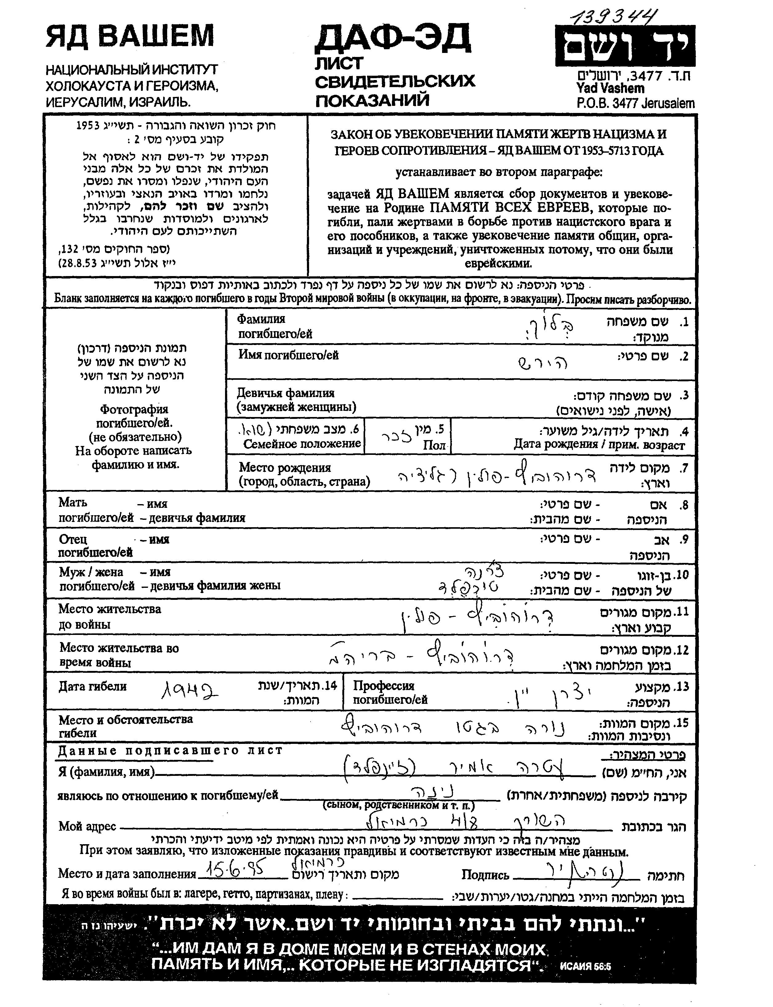 Hirsh wurde in der Schoah ermordet. Todesort: Drohobycz, Polen im Jahr 1942.