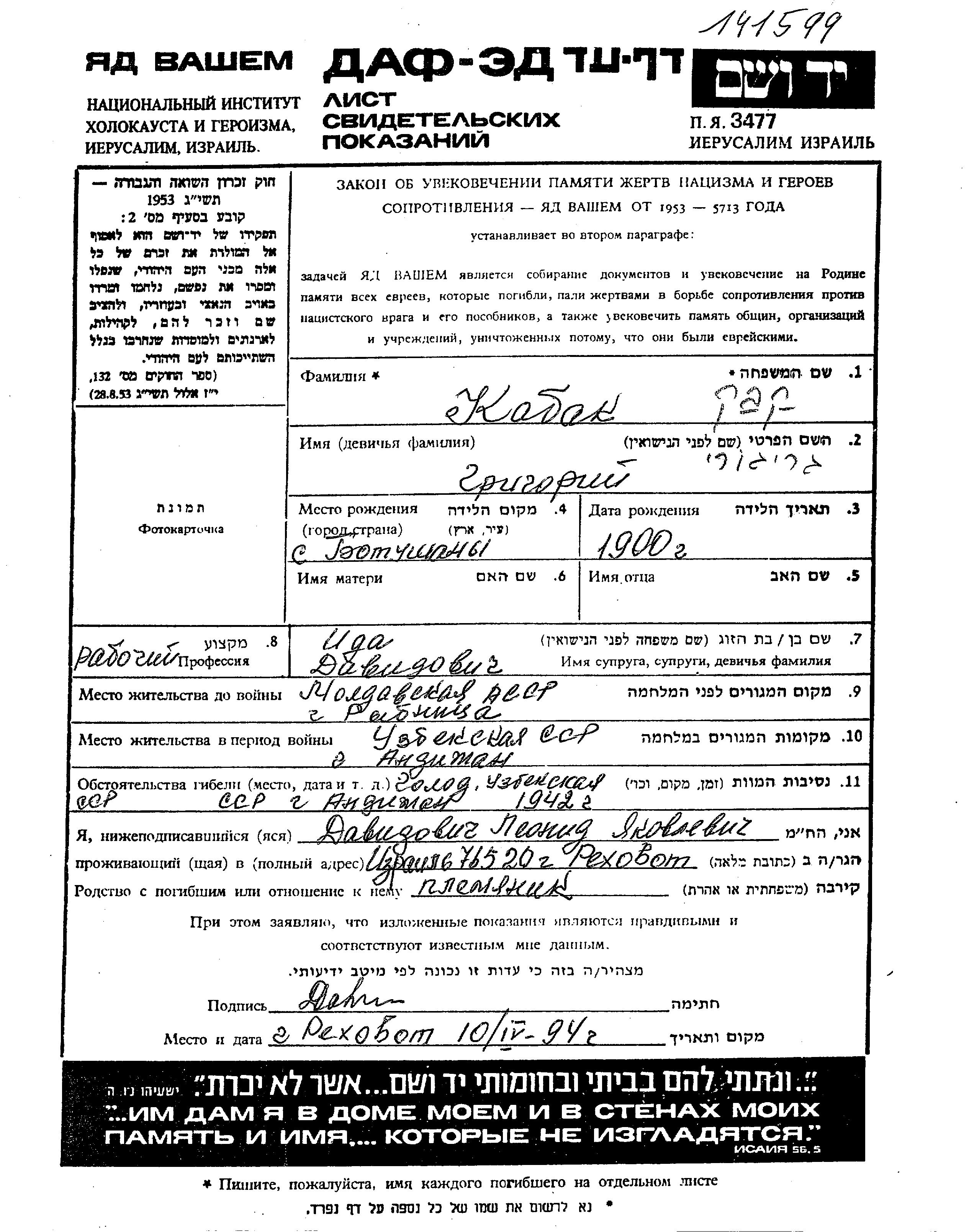 Grigori Kabak wurde im Jahr 1900 in Botosani, Rumänien geboren. Er war Arbeiter/-in und mit Ida Verheiratet. Vor dem Zweiten Weltkrieg lebte er in Rybnitsa, Ukraine (UdSSR). Während des Krieges war er in Andizhan, Uzbekistan (UdSSR).