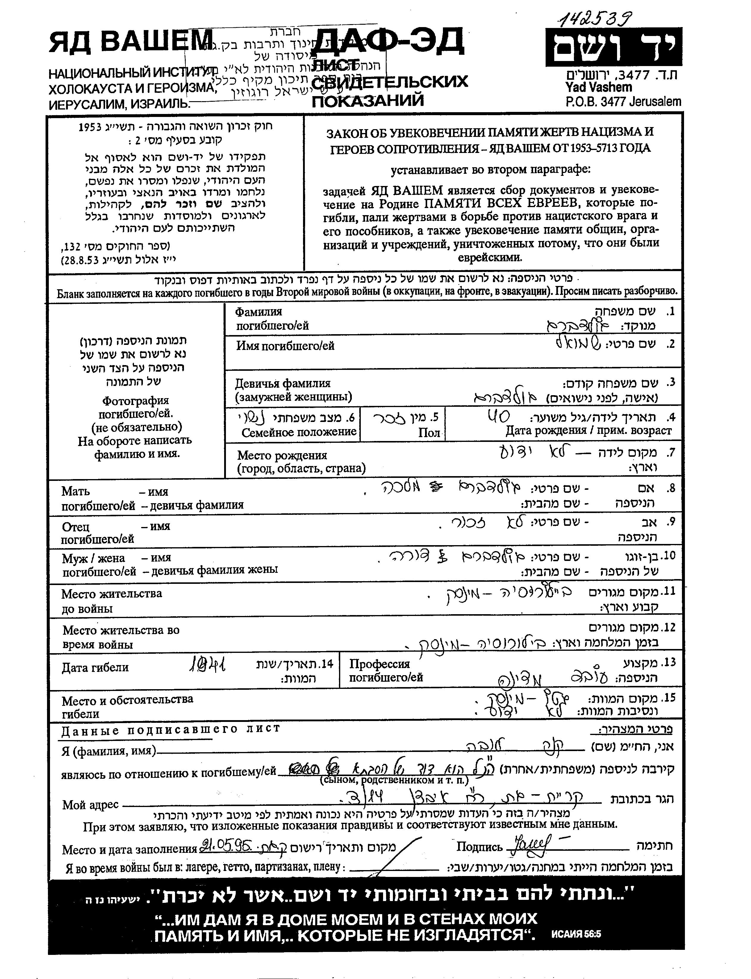 Shmuel wurde in der Schoah ermordet. Todesort: Minsk, Weißrussland (UdSSR) im Jahr 1941.