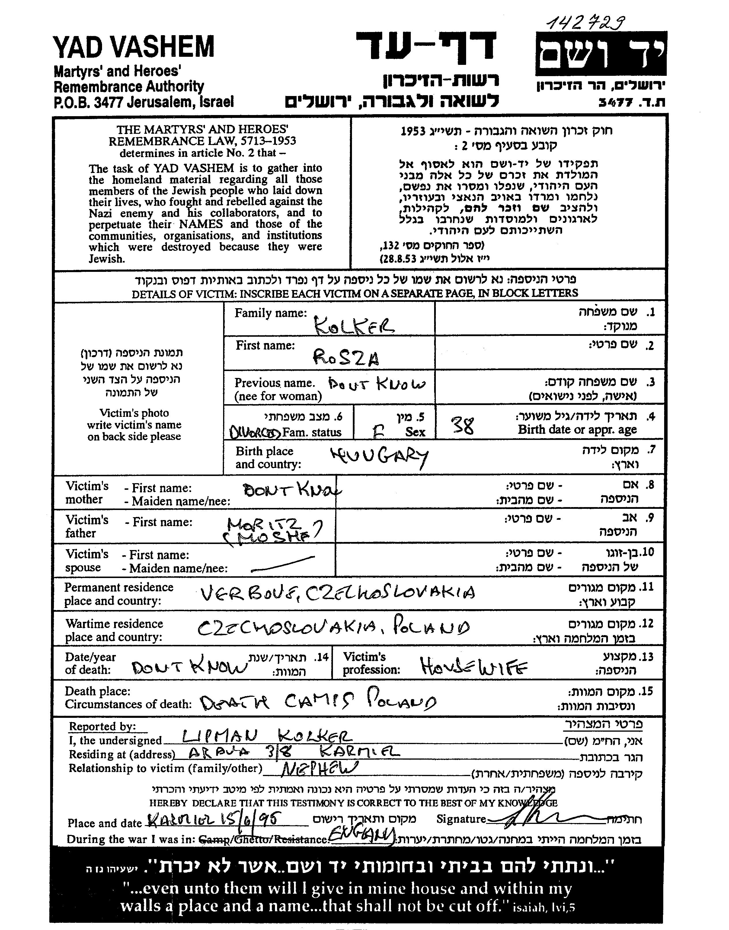 Rosza Roza Kolker wurde in Ungarn geboren. Sie war die Tochter von Moritz Moshe. Sie war Hausfrau und Geschieden. Vor dem Zweiten Weltkrieg lebte sie in Vrbove, Tschechoslowakei. Während des Krieges war sie in Tschechoslowakei.