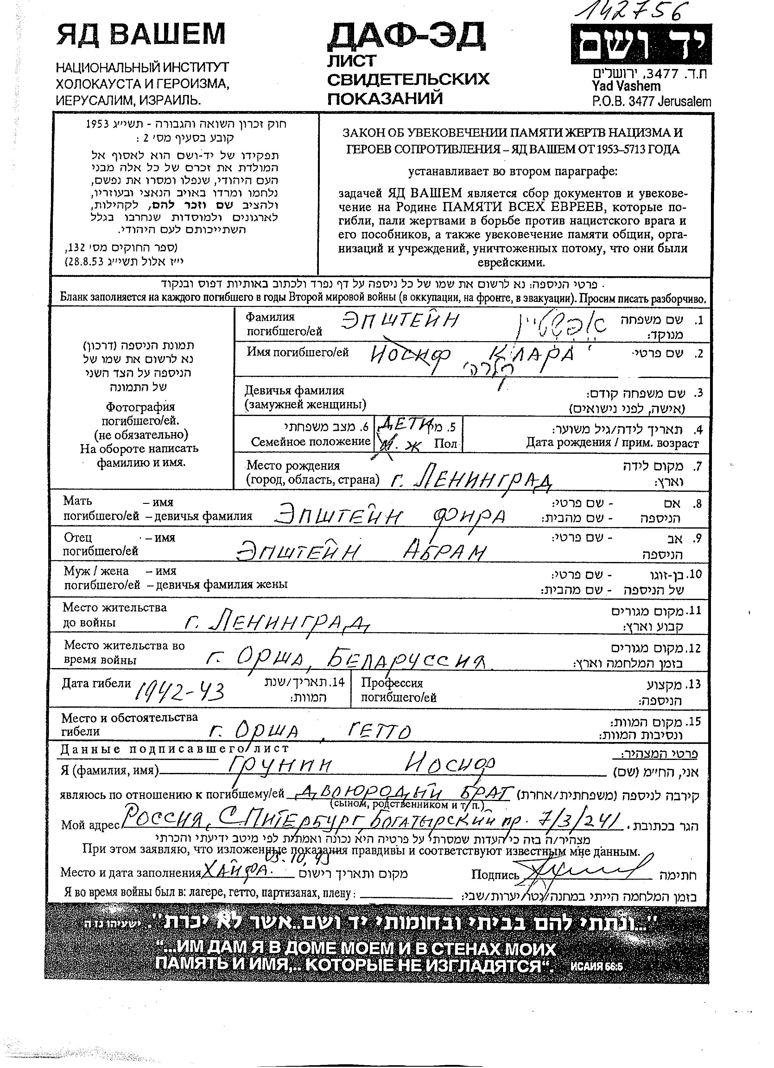 Klara Epshtein wurde in Leningrad, Russland (UdSSR) geboren. Sie war die Tochter von Abram und Fira. Sie war Kind. Vor dem Zweiten Weltkrieg lebte sie in Leningrad, Russland (UdSSR). Während des Krieges war sie in Orsha, Weißrussland (UdSSR).