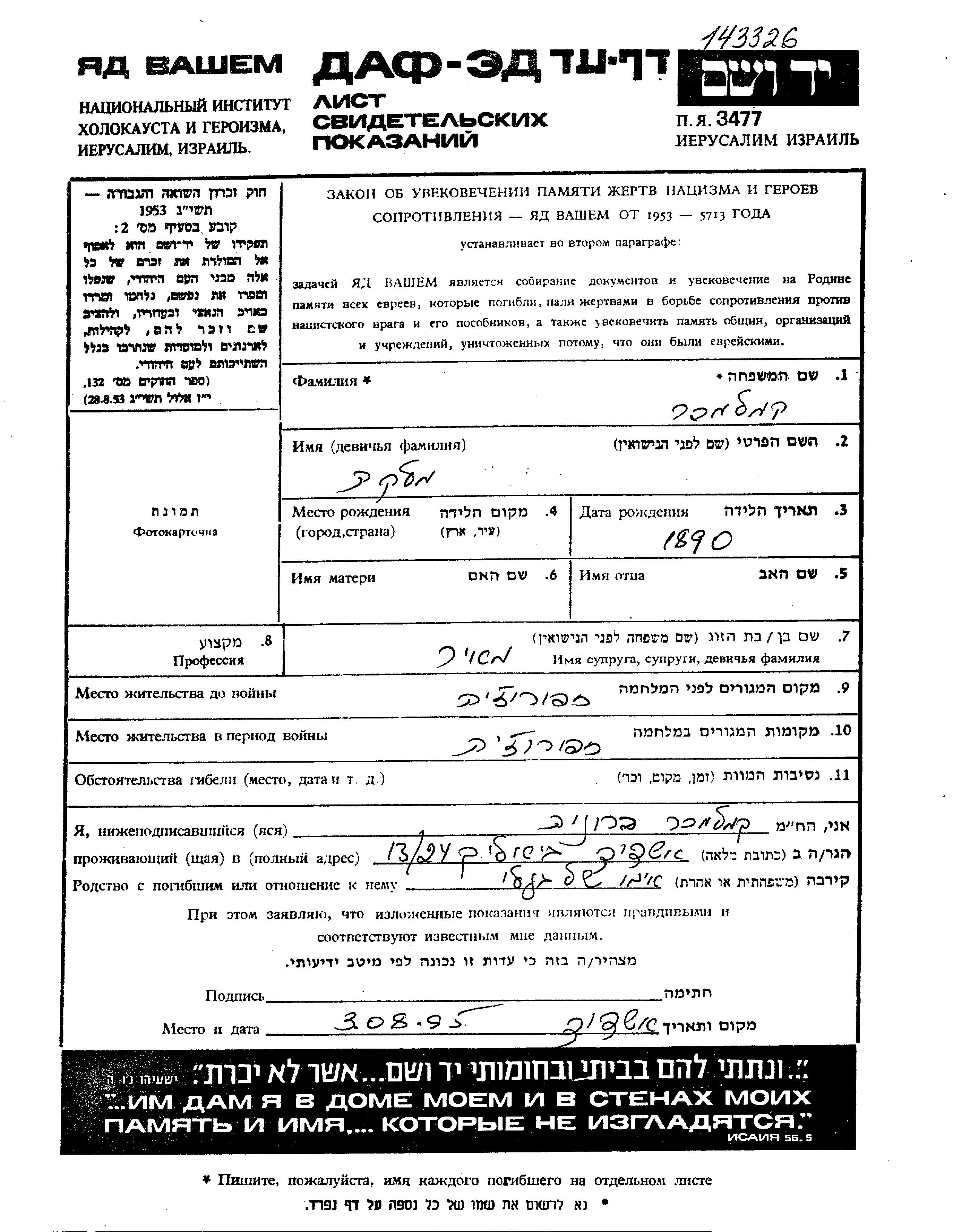 Malka Kemelmakher wurde im Jahr 1890 geboren. Sie war mit Meir Verheiratet. Vor dem Zweiten Weltkrieg lebte sie in Zaporozhye, Ukraine (UdSSR). Während des Krieges war sie in Zaporozhye, Ukraine (UdSSR).